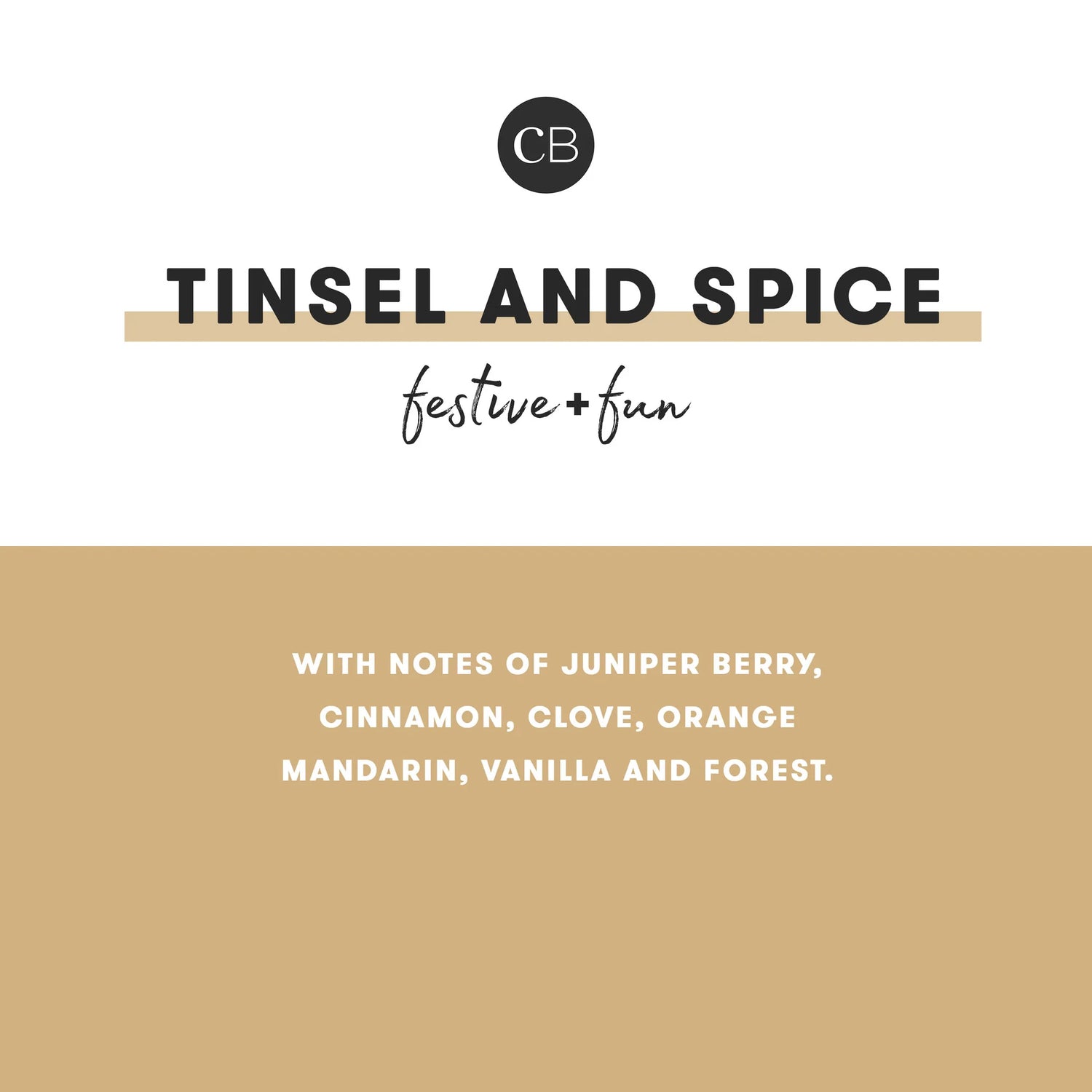 Deck the halls with this beautiful Tinsel & Spice Glimmer Mini Tin Candle. It packs a festive punch with notes of juniper berry, cinnamon and clove with a twist of orange mandarin, vanilla and forest woods.