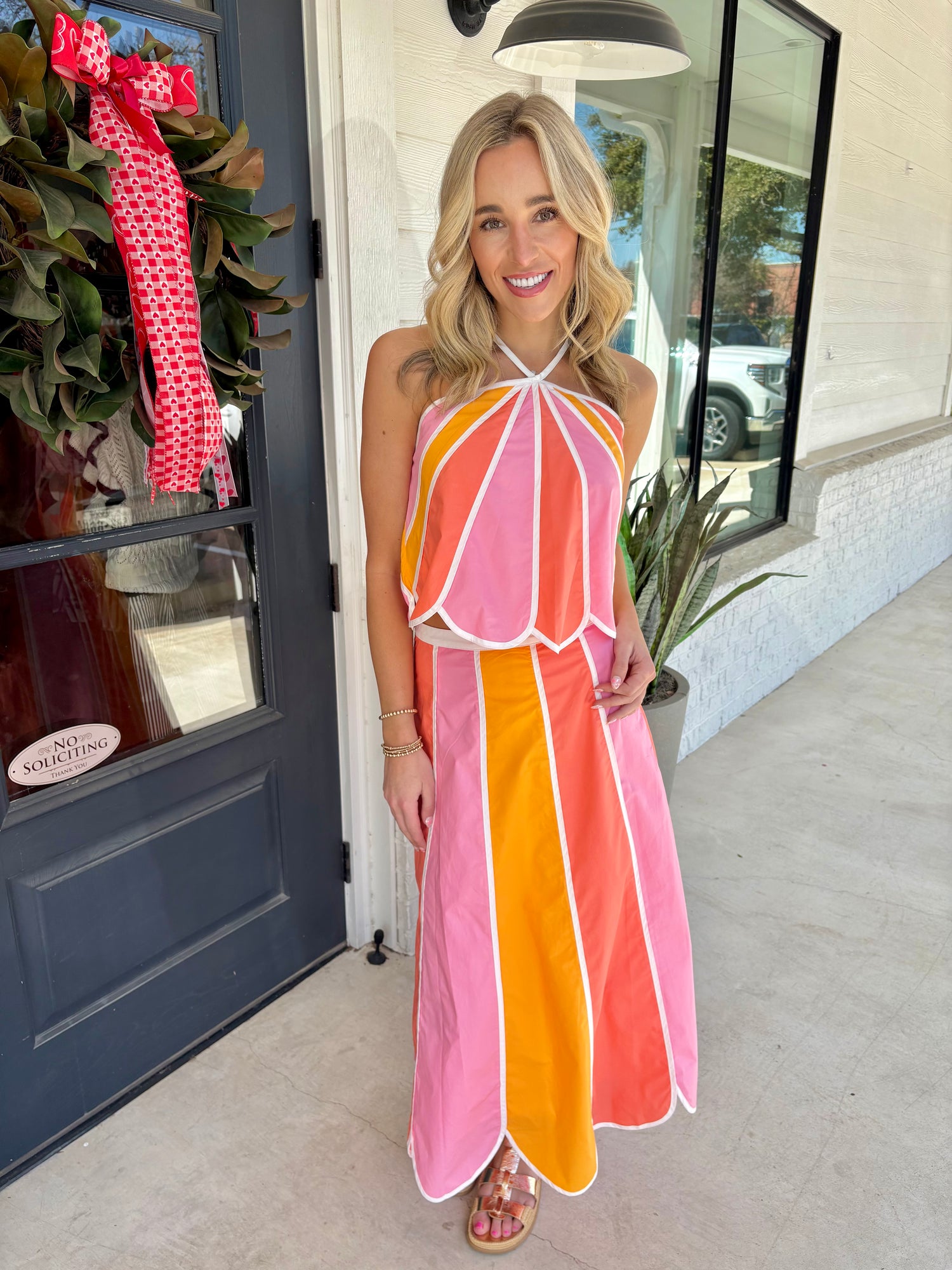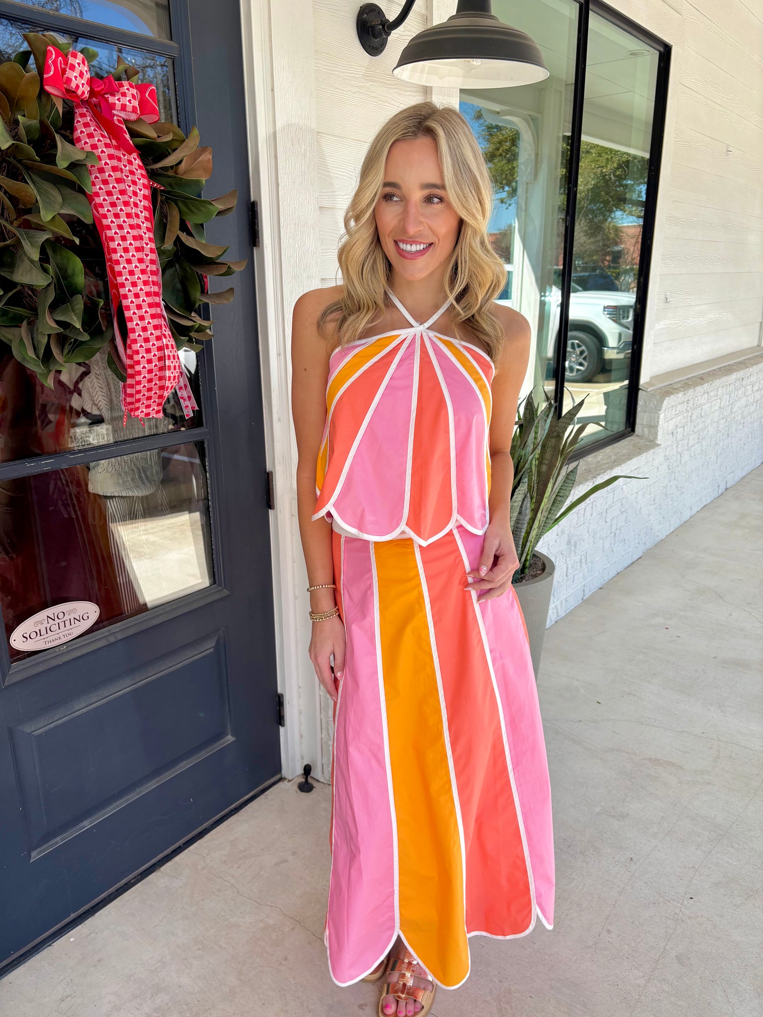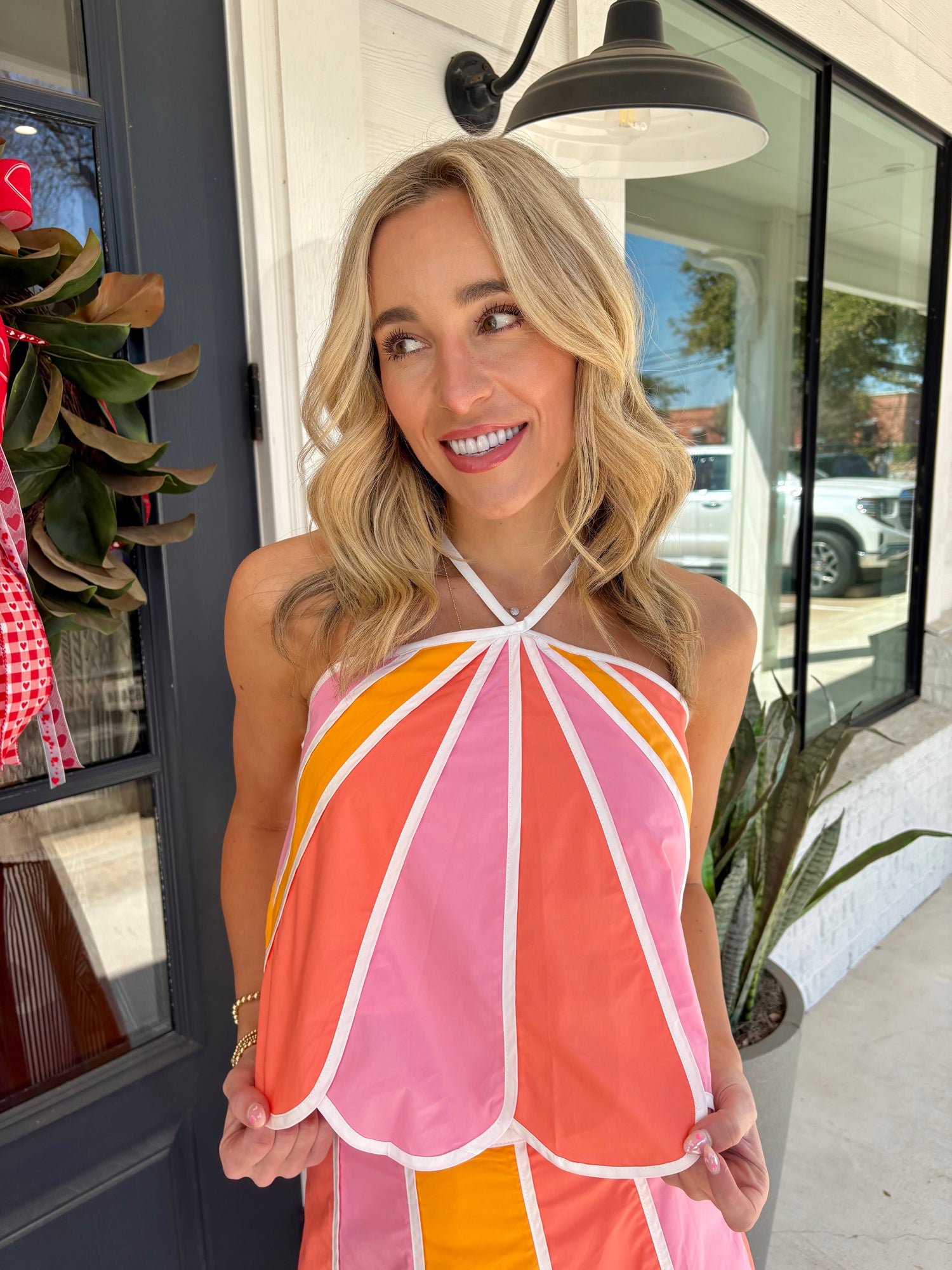 Elevate your wardrobe with this stunning New Horizons Halter Top! The delicate scalloped trim adds a touch of feminine charm and sophistication to any outfit. The flattering halter neckline creates a chic silhouette while offering comfortable support. Perfect for date nights, brunch with friends, or any occasion where you want to feel confident and fabulous. This versatile piece pairs beautifully with jeans, skirts, or tailored pants for endless styling possibilities. Get ready to turn heads!