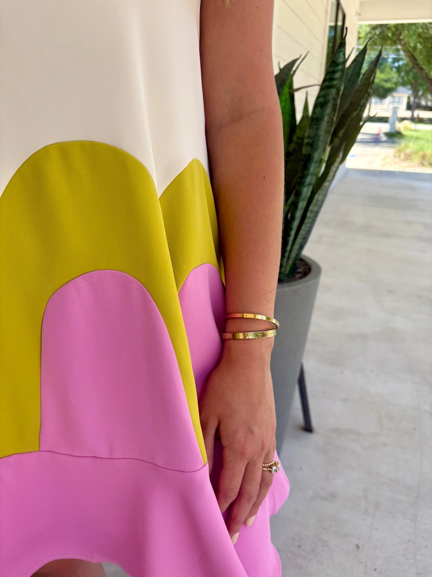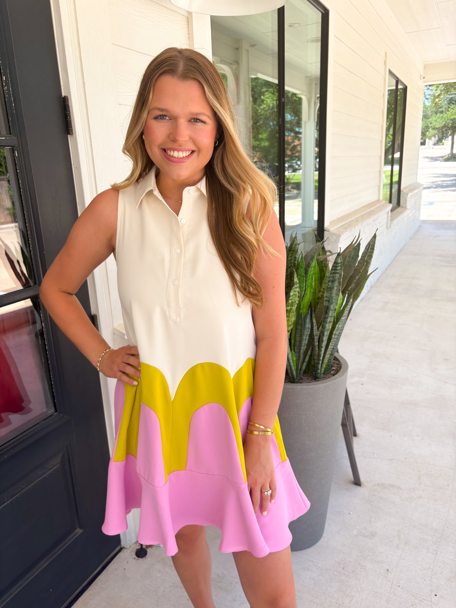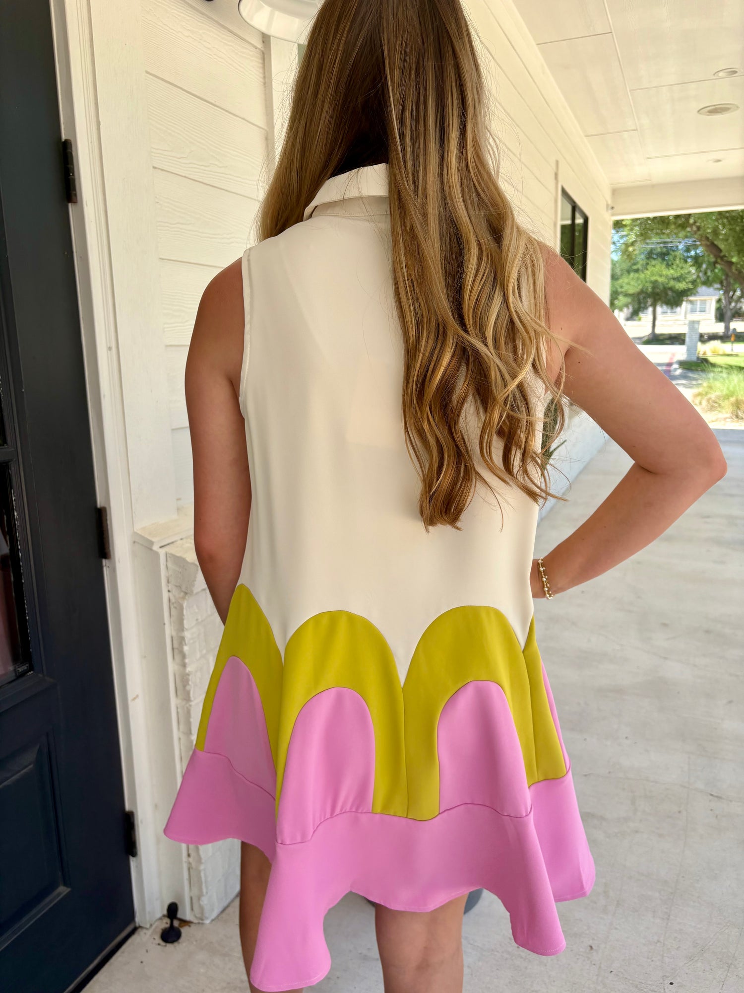 Whether you're strolling through town or meeting up for coffee, this mini dress will keep you feeling cute and stylish! With its playful design, it's perfect for showing off your sweet side. It Features a fully lined material with a lime punch and violet colored design on the skirt, a collared neckline, a 4-buttoned bodice, a sleeveless cut & a relaxed silhouette that ends in a mini dress length hemline.