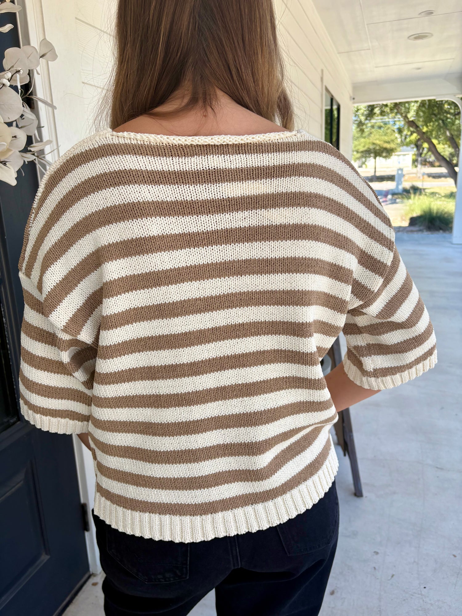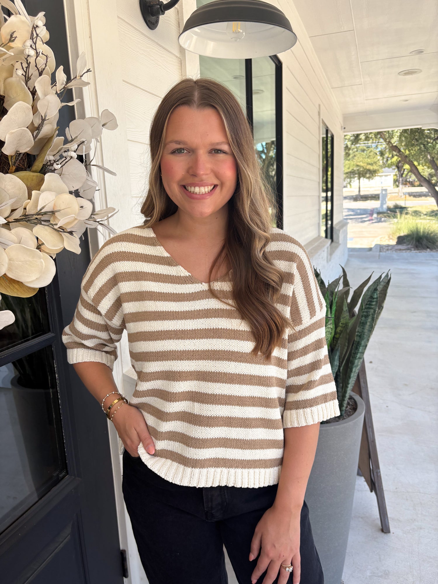 Get ready to turn heads with the 'Cafe Hangout Short Sleeve Sweater Top from in mocha & cream! This top features a trendy deep V-neck and flattering short sleeves, perfect for any occasion. The mocha stripes add a pop of color to any outfit. Don't miss out on this one! It is sure to go so fast!!
