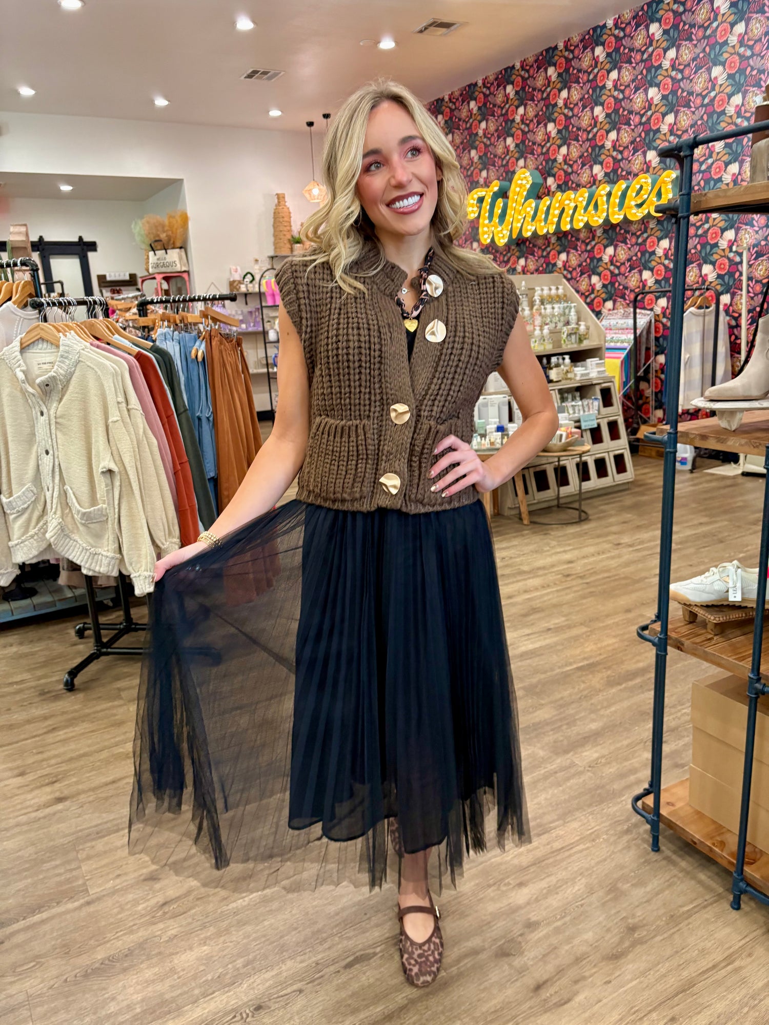 Cozy meets chic in the NEW Chloe Brown Sweater + Gold Button Sweater Vest! Great for layering or wearing solo, you can't go wrong with this trending beauty! She features a woven brown sweater fabric, 4 oversized gold-bronze buttons for dramatic detail and an oversized fit to keep you comfy yet chic every time!