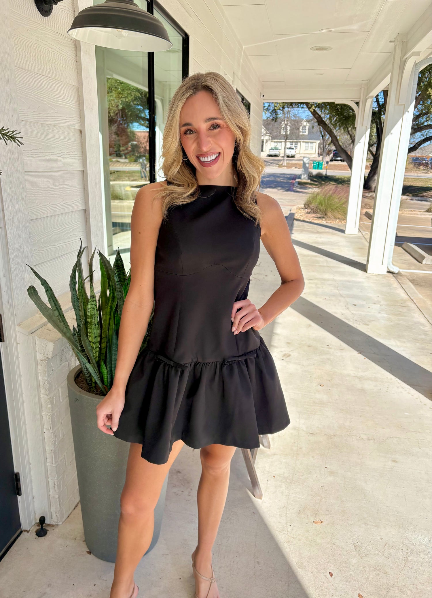 The Delaney Dress combines timeless silhouette with contemporary polish. This fit-and-flare mini features a structured bodice that flatters the waistline with bow accents at ruffle. Crafted from premium fabric, it offers comfortable stretch and refined drape. Perfect for elevated casual occasions or dressed up for evening events, this versatile piece transitions seamlessly from day to night.