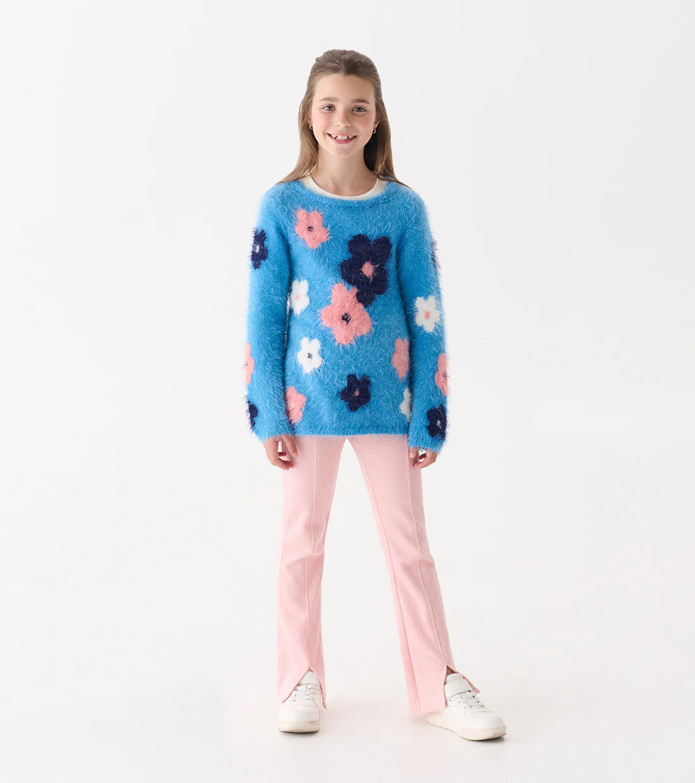 Brighten up her winter wardrobe with the Girls Floral Cluster Furry Sweater, crafted from a cozy nylon-acrylic blend for a soft, slightly fuzzy feel. This long-sleeve sweater features a vibrant blue base adorned with a playful floral design in shades of pink, white, and navy, adding a cheerful pop of color to chilly days. With a rounded neckline and ribbed detailing at the hem, sleeves, and collar, it combines style with snug comfort.