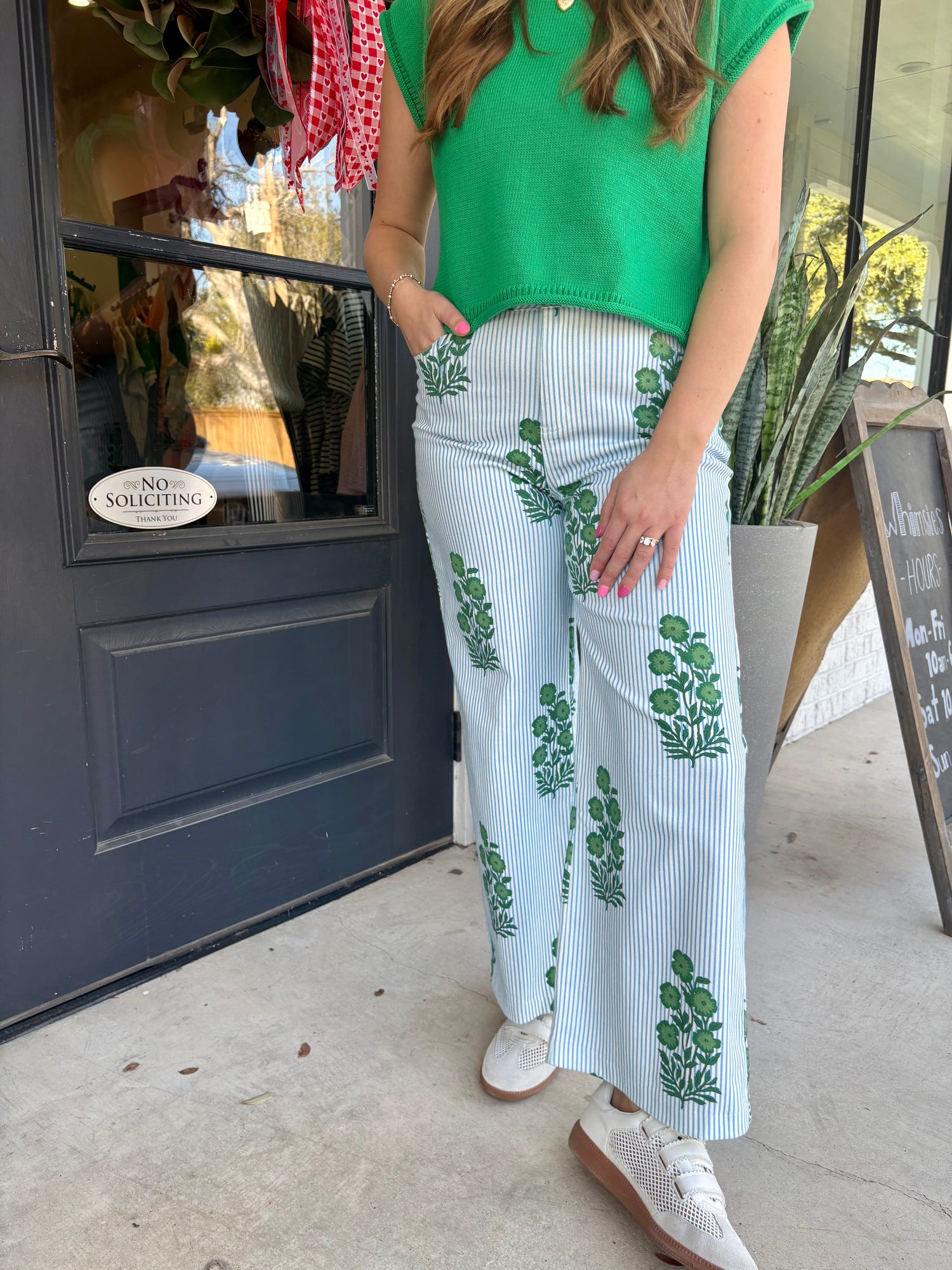 These fresh and playful wide-leg pants feature a soft blue pinstripe base accented with delicate green floral motifs for a charming, elevated look. Designed with a flattering high waist and relaxed leg, they offer both comfort and effortless style. Lightweight and easy to wear, these pants are perfect for warm days, casual outings, or styled up for brunch and garden gatherings.
