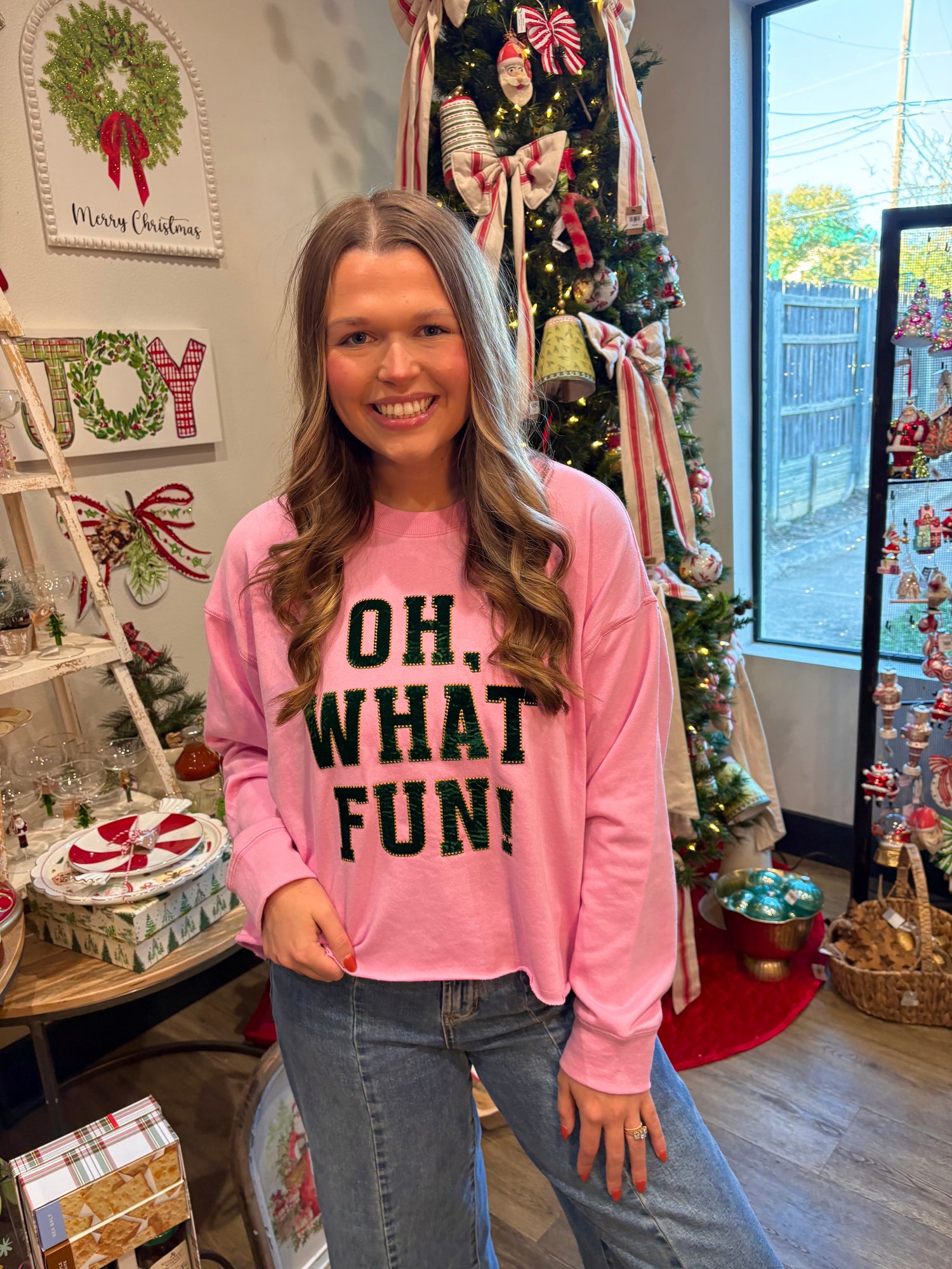 Bring the holiday cheer in full color with the "Oh What Fun" Lounge Sweatshirt. This cropped crewneck features bold green varsity-style lettering outlined in gold embroidery, all set against a playful pink background. Its relaxed fit makes it perfect for lounging, gift wrapping, or matching with your crew. Pair it with the coordinating Checkered Boxer Shorts—or mix and match with any of our other merry pieces for a festive look from head to toe.