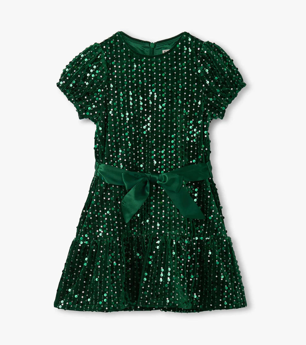 Make her sparkle at every celebration with the Girls Green Sequins Velvet Dress, a stunning piece designed to dazzle. Crafted in rich emerald green velvet and adorned with all-over sequins, this fully lined dress catches the light from every angle while offering soft comfort inside. It features a classic round neckline, short sleeves, and a secure back zip closure for easy dressing. A separate waistband with a front bow adds a sweet, tailored touch, while the flared tiered skirt brings volume and movement for extra flair.