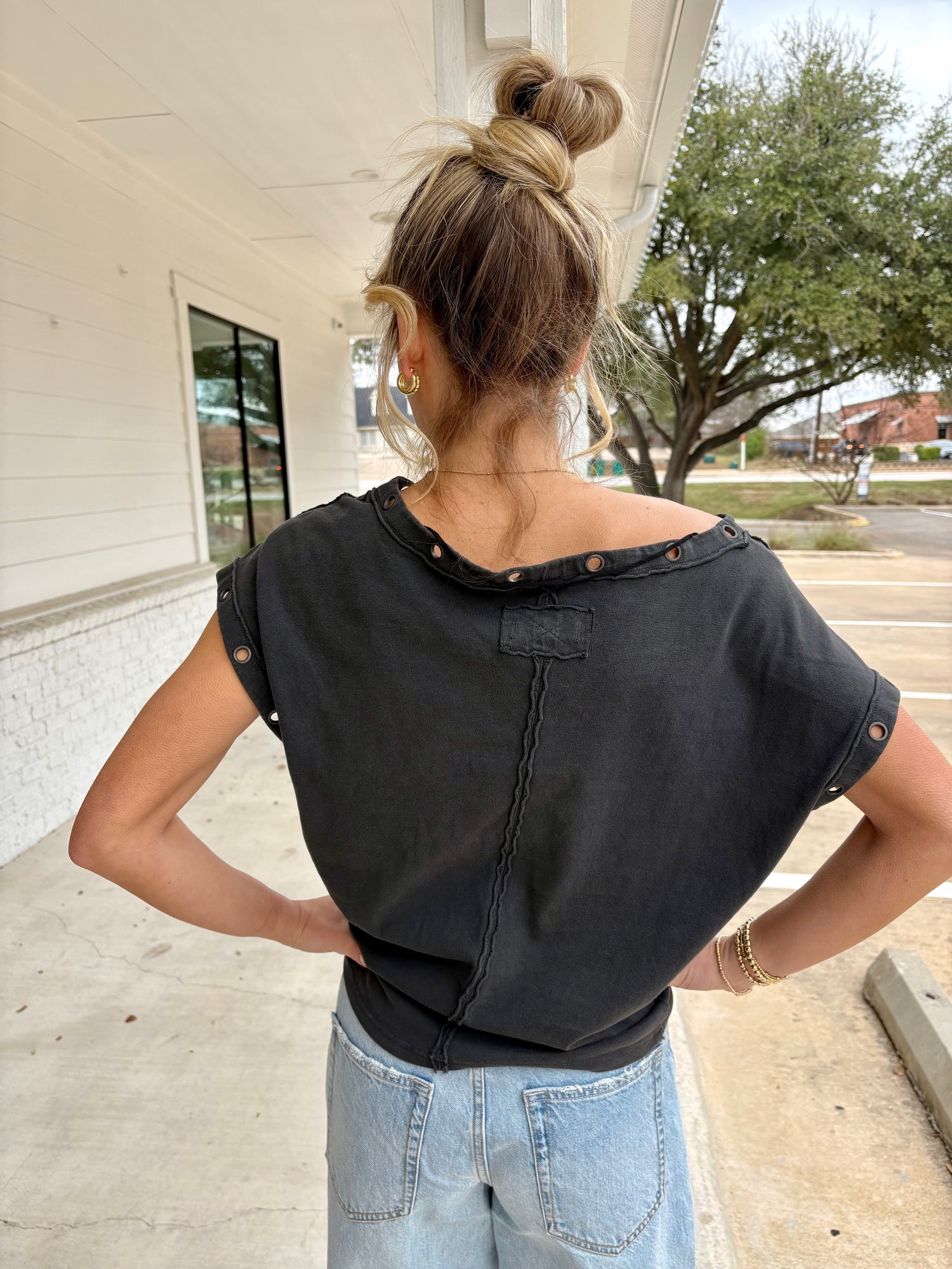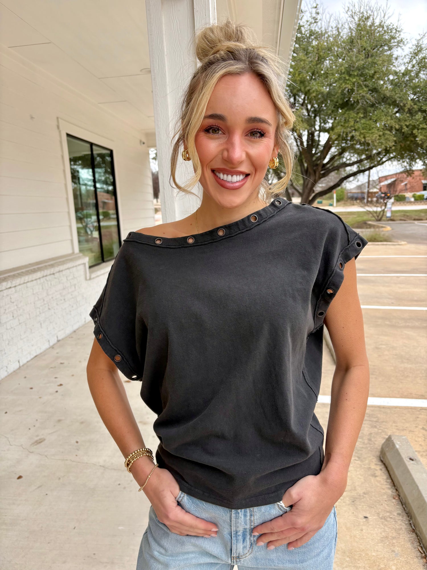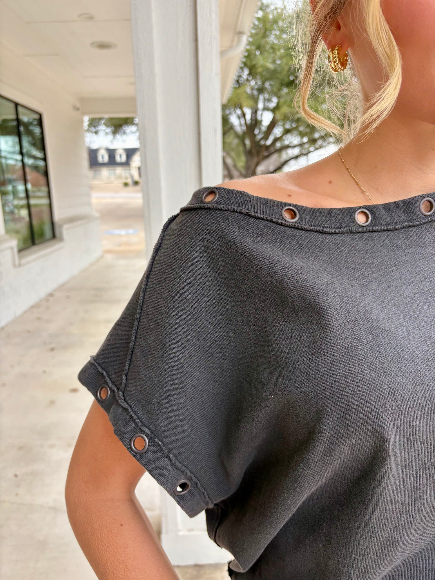 Grommet details give this off-the-shoulder tee from We The Free Collection the perfect touch of edge.