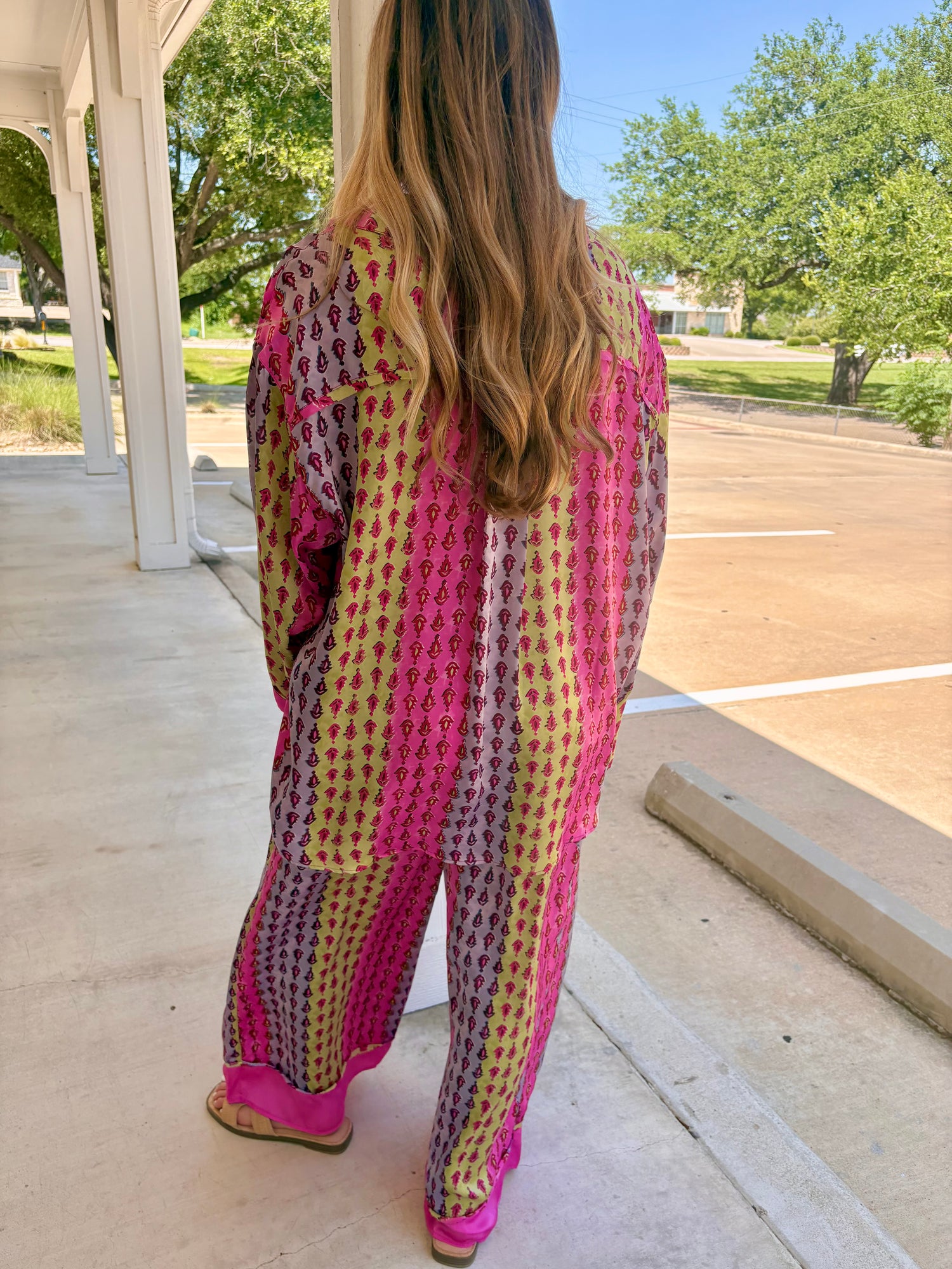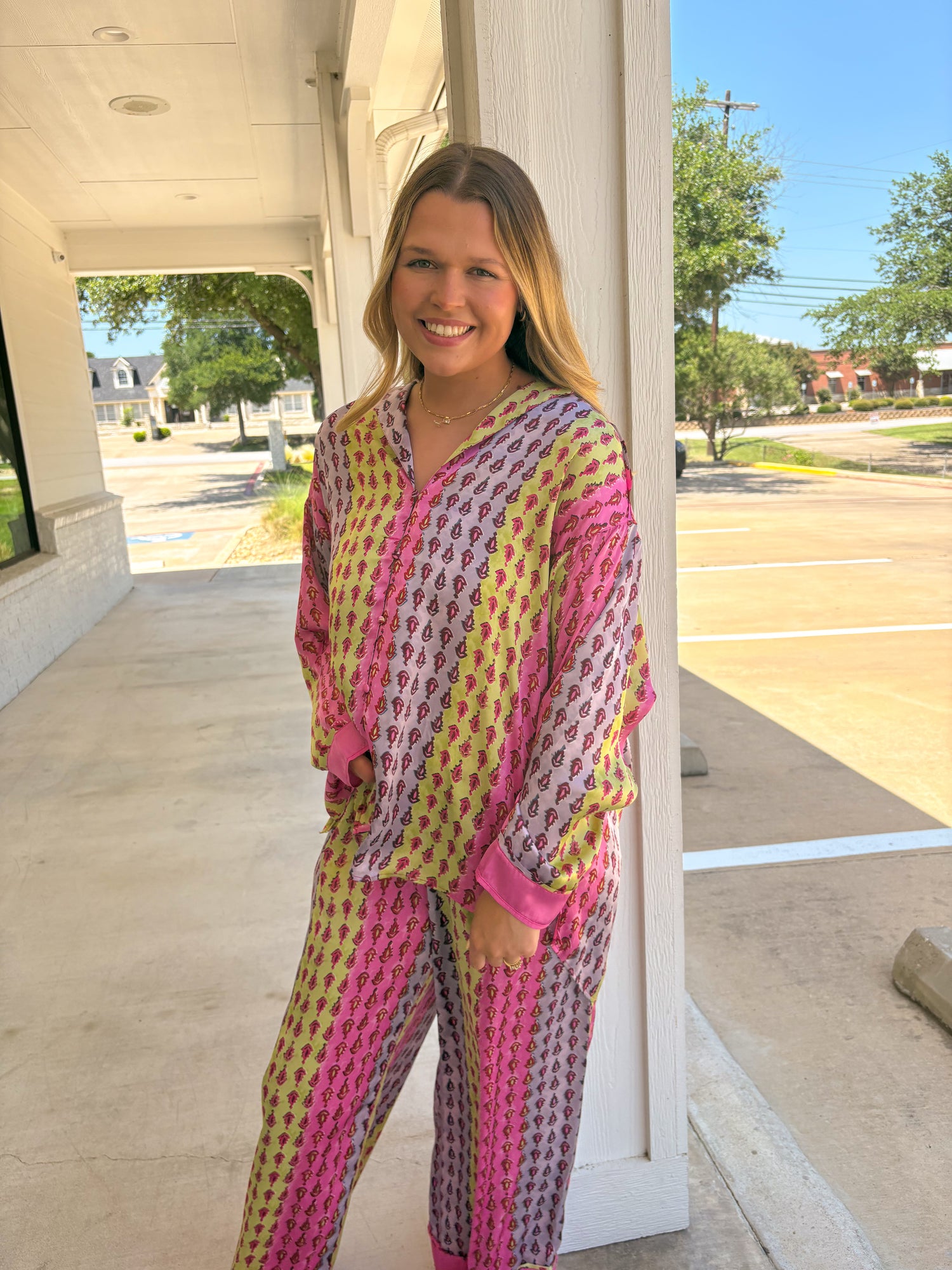 Features: Lightweight and breathable, soft printed fabrication, button-front top, elastic waistband with adjustable drawstring, wide-legs