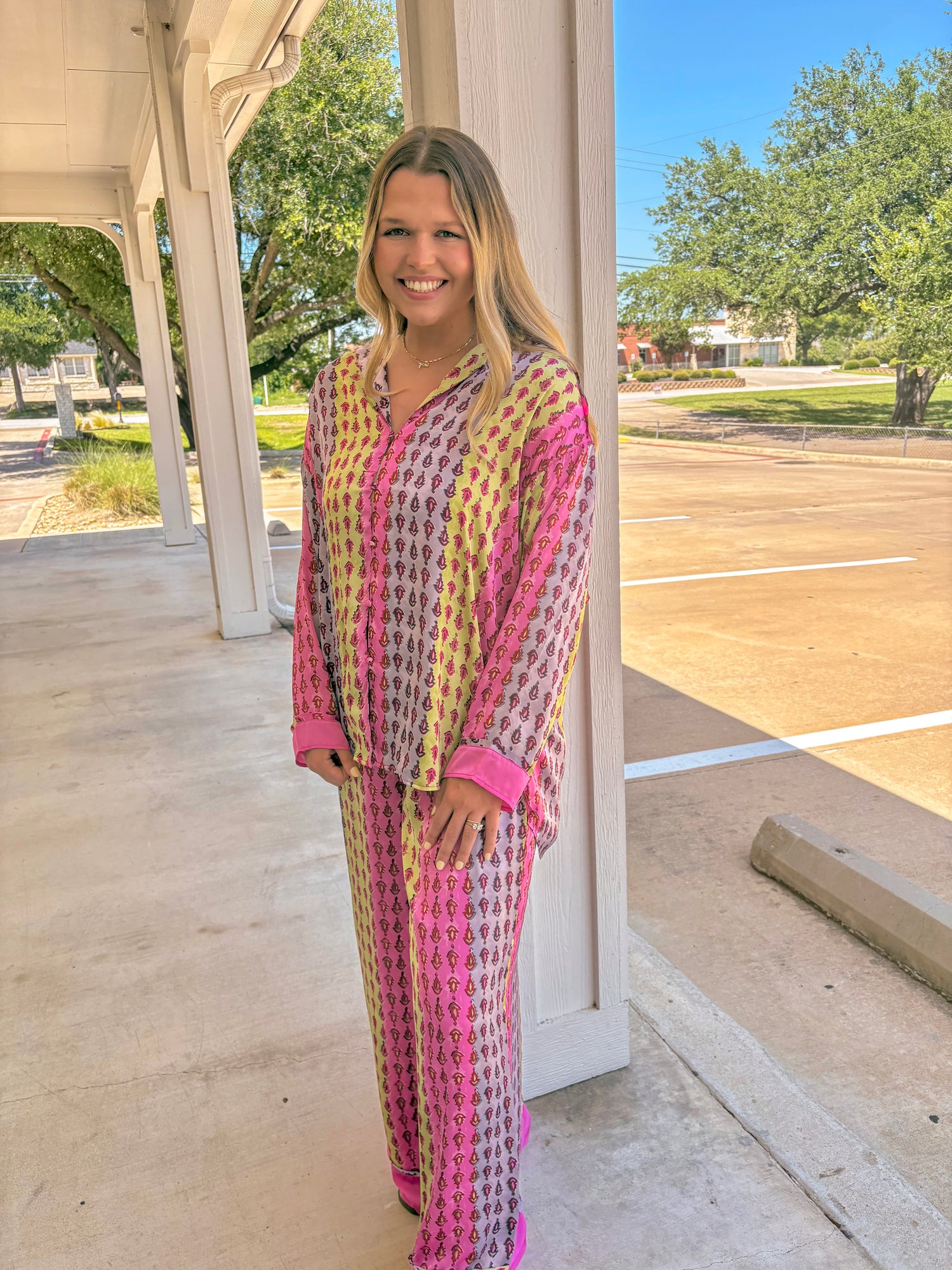 So essential pajama set featured in a soft printed fabrication and oversized silhouette with a long-sleeve top and matching wide-leg bottoms.