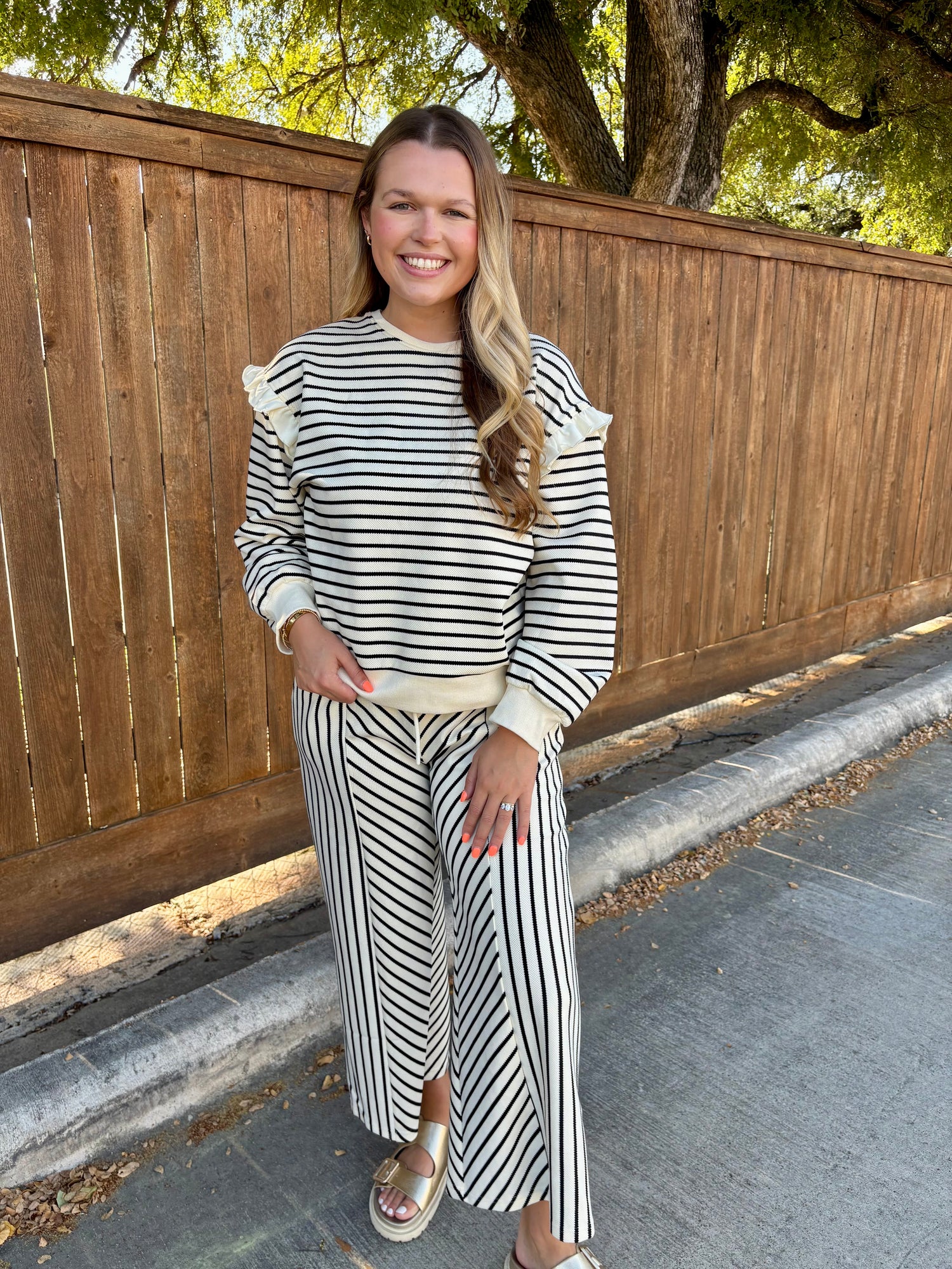 Meet the 'Laid Back Feels Pants' - tailored yet relaxed. A Fall staple in one of the most flattering silhouettes - it hugs you in the right places and the gradual flare creates a more fashion-forward vibe. High waisted (but can be worn lower) relaxed flared pant that features an elastic and drawstring waist so you can tailor the fit to be perfect for you. Wear with the matching top for the cutest set!