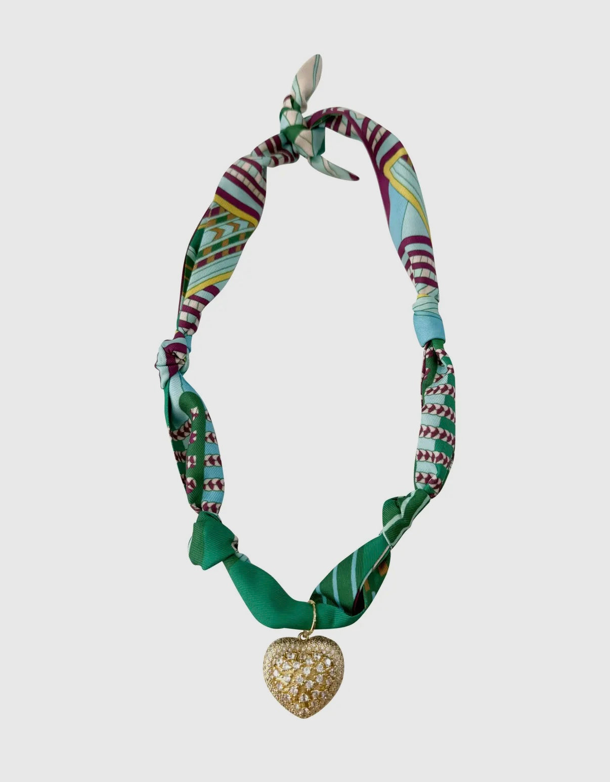 Fresh, bold, and full of personality. This green knotted scarf necklace is finished with a radiant 18k gold-plated heart charm that adds the perfect pop of shine. Wear it as a necklace, wrap it as a bracelet, or tie it to your bag for a versatile, color-forward accent. Designed in Dallas, Texas, this piece brings a vibrant touch to your layered look.