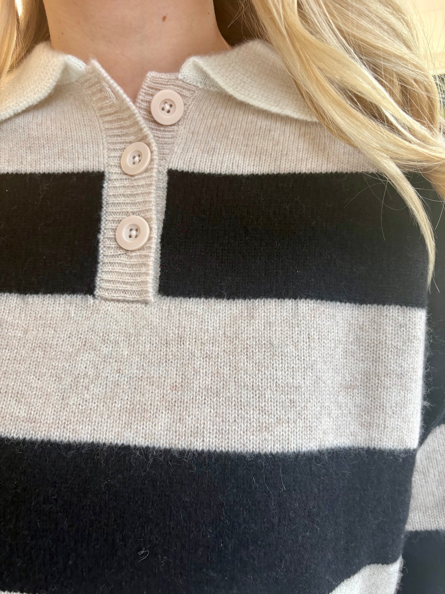 The 'Charleston Charm Sweater Top' is a timeless classic. Featuring black and beige stripes with a crisp white collar and beige button detailing, this short-sleeve knit is both polished and effortlessly wearable. The oversized sleeves and relaxed fit make it perfect for tucking into high-rise trousers or pairing with your favorite denim. Whether dressed up for the office or styled casually for the weekend, Sabrina is a versatile piece you’ll reach for again and again.
