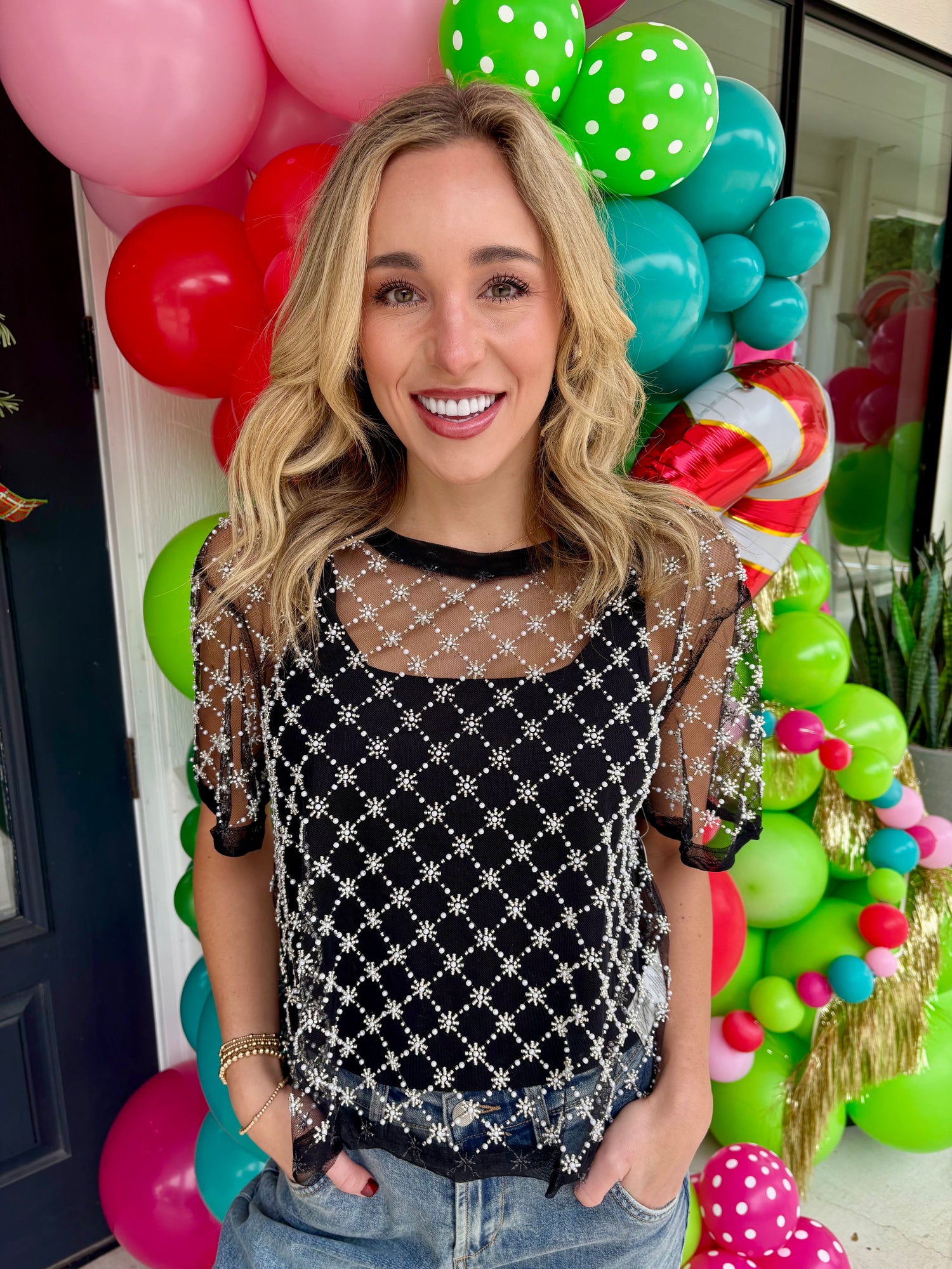Level up your layered looks every season with this stunning top, featuring a sheer mesh fabrication, a boxy, tee-inspired silhouette, and dazzling embellished details throughout to create an elevated feel.