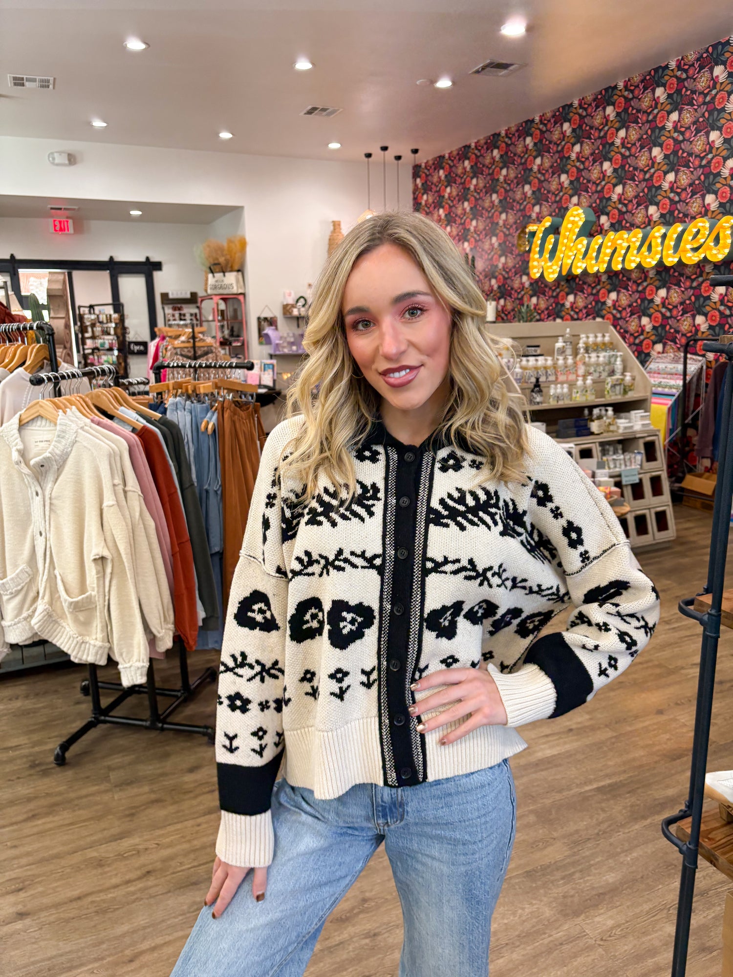 Get cozy in this sweet cardi, featured in a comfy cotton knit with a collared neckline and darling floral print.