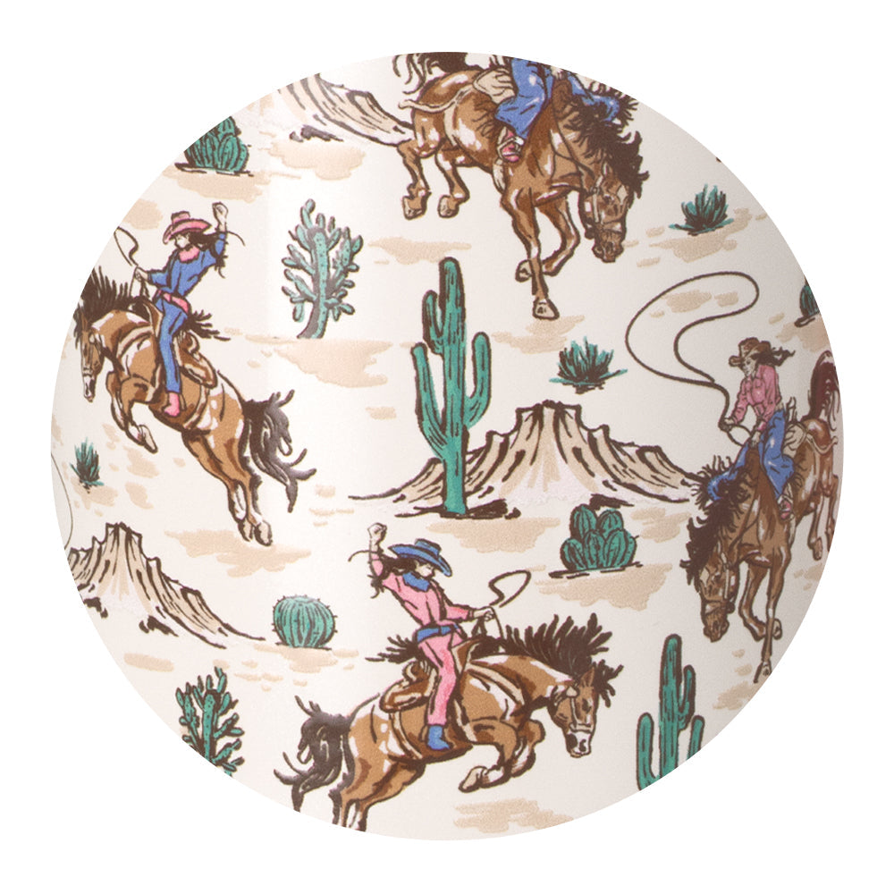 New lid, zero leaks, same great size! Get rodeo ready with this illustrated design of cowgirls riding bucking broncos, with desert scenery on a glitter ivory background.