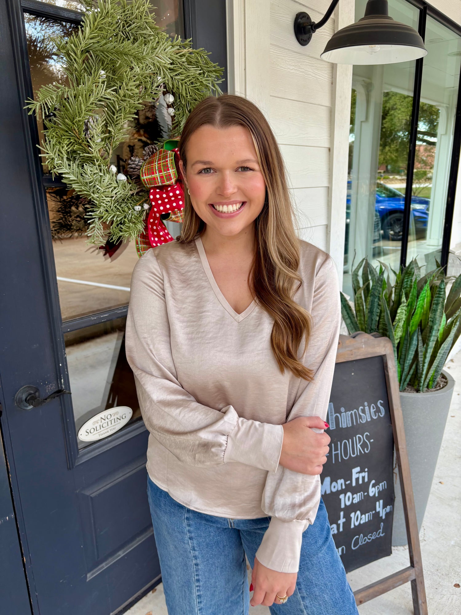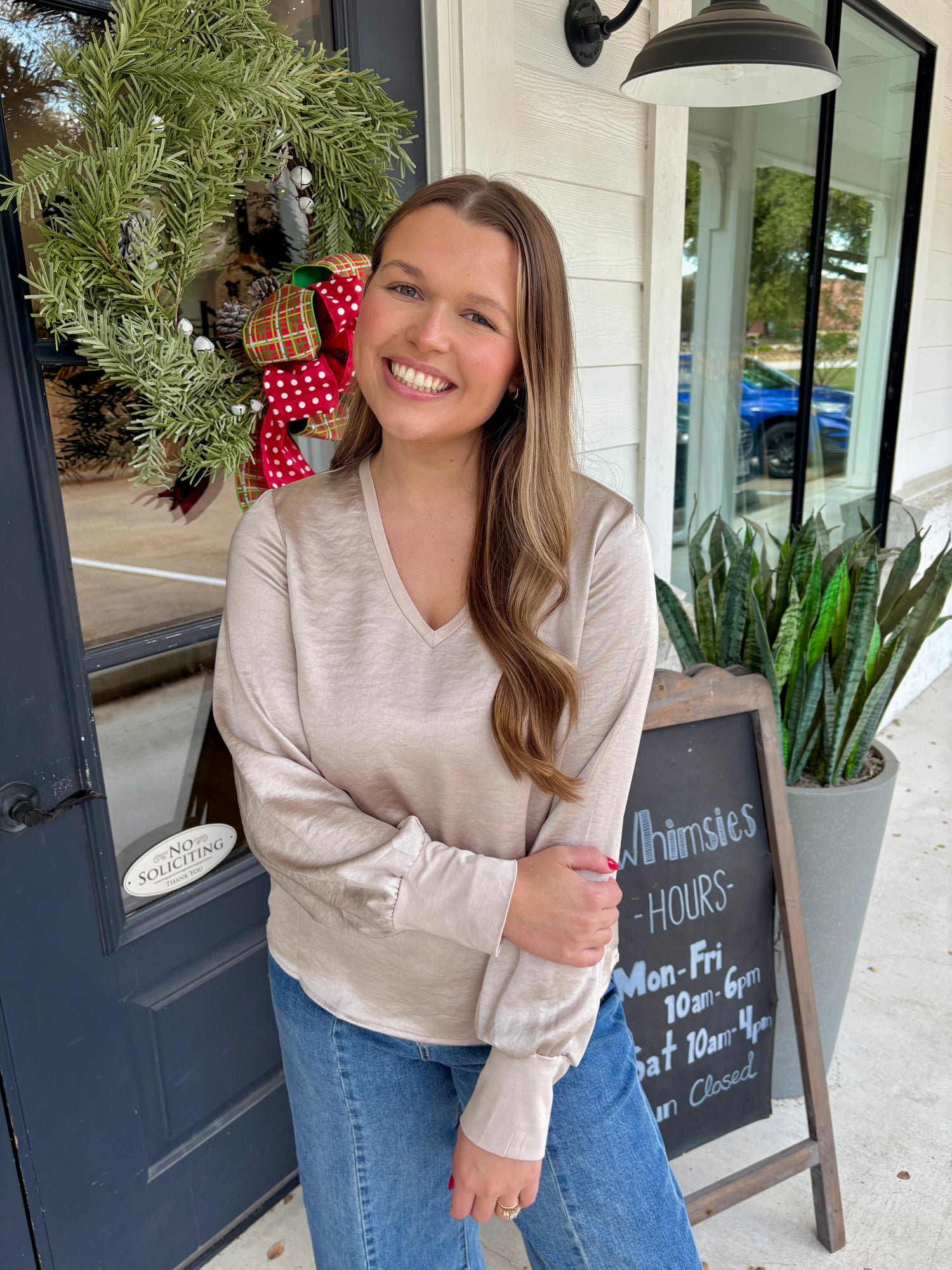 Aya v-neck long sleeve satin top, a versatile piece in smooth satin fabric drapes beautifully, offering a luxurious feel against the skin. In classic fitting that is perfect for dressy occasions or casual wear, this top accentuates any outfit statement.