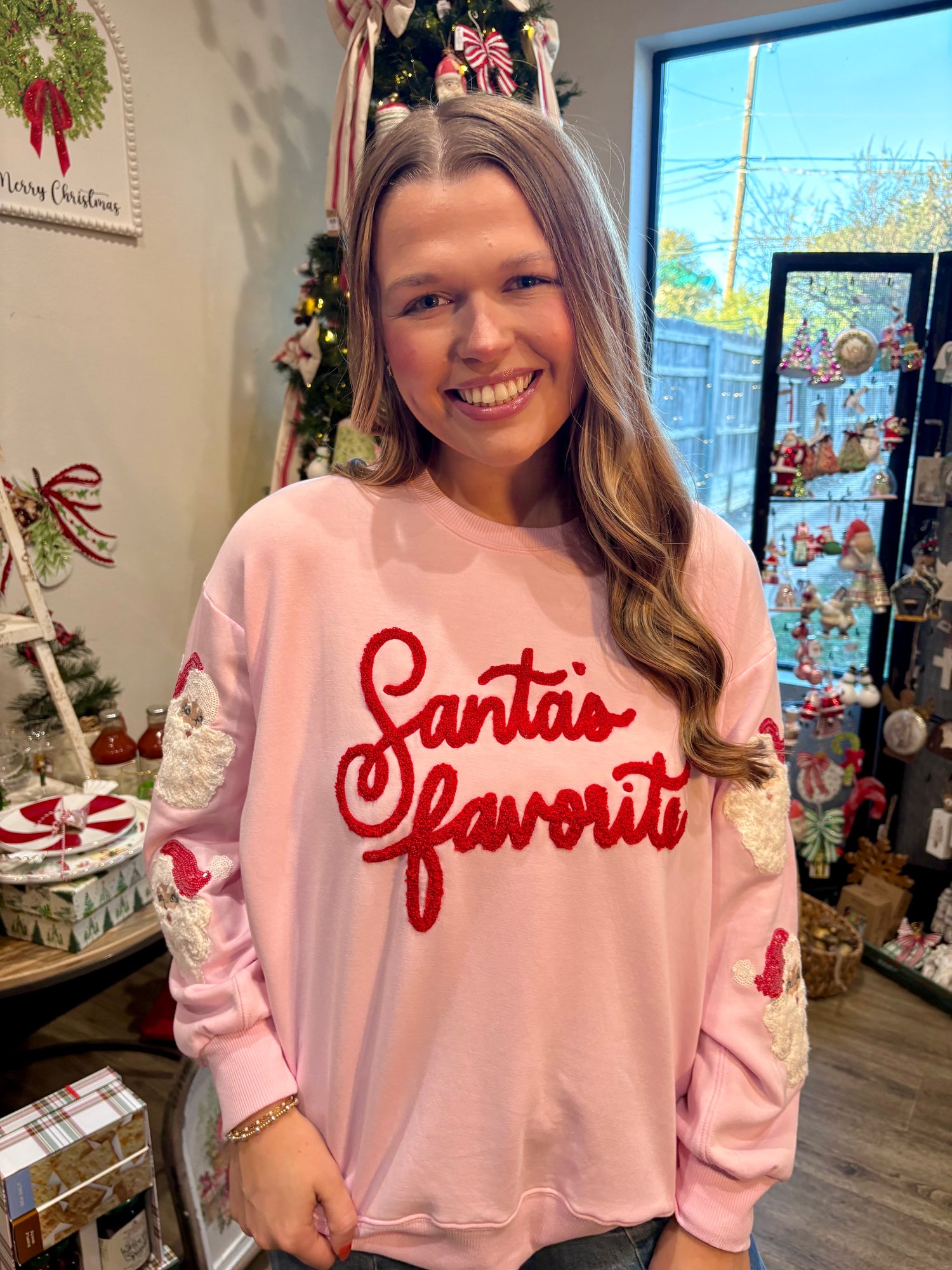 Celebrate the season in cozy, effortless style with the Santa's Favorite Sarah Sweatshirt. Featuring a classic crew neckline, relaxed drop shoulders, and ribbed trim, it offers a comfortable, relaxed fit perfect for holiday gatherings, winter outings, or cozy days at home. Soft, snuggly, and full of festive charm, the Santa's Favorite Sarah Sweatshirt is a seasonal must-have for your wardrobe.