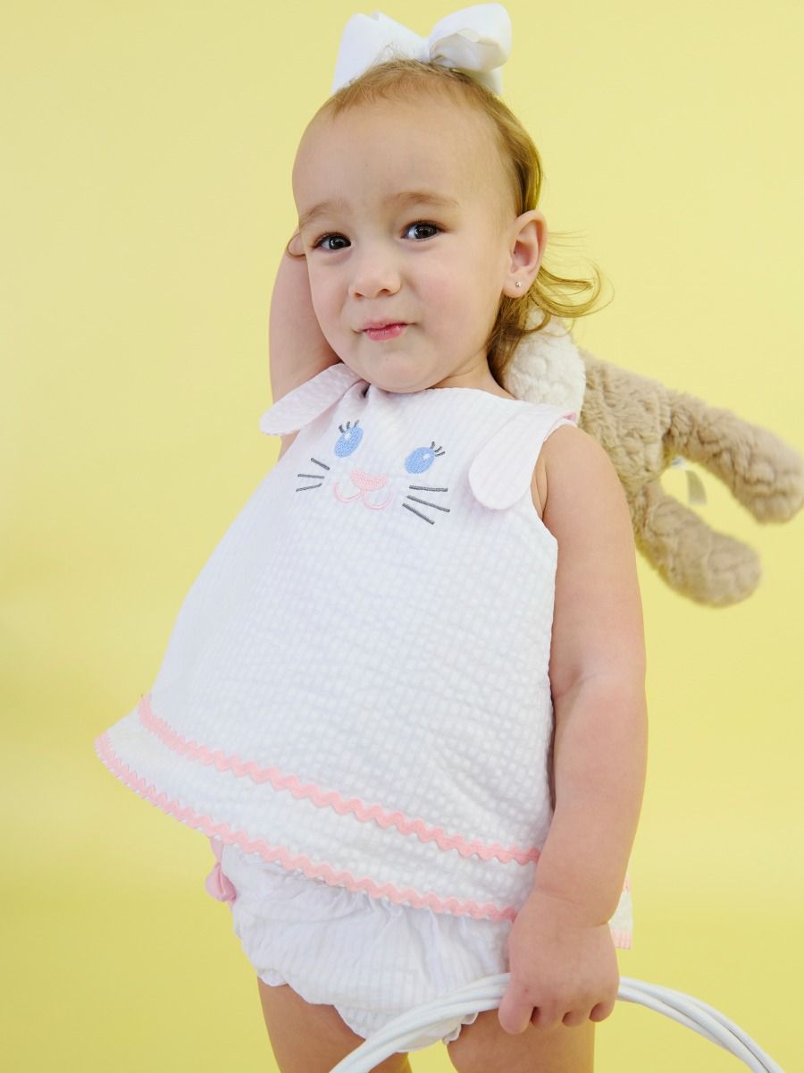 This set is a must-have addition to your little girl's spring wardrobe. This stylish clothing set is designed with a comfortable fit in mind, ensuring your child can play and move freely. The swing top, adorned with an applique bunny, adds a touch of kids fashion to any occasion. The bloomer, featuring the same seer sucker fabric, complements the top perfectly.