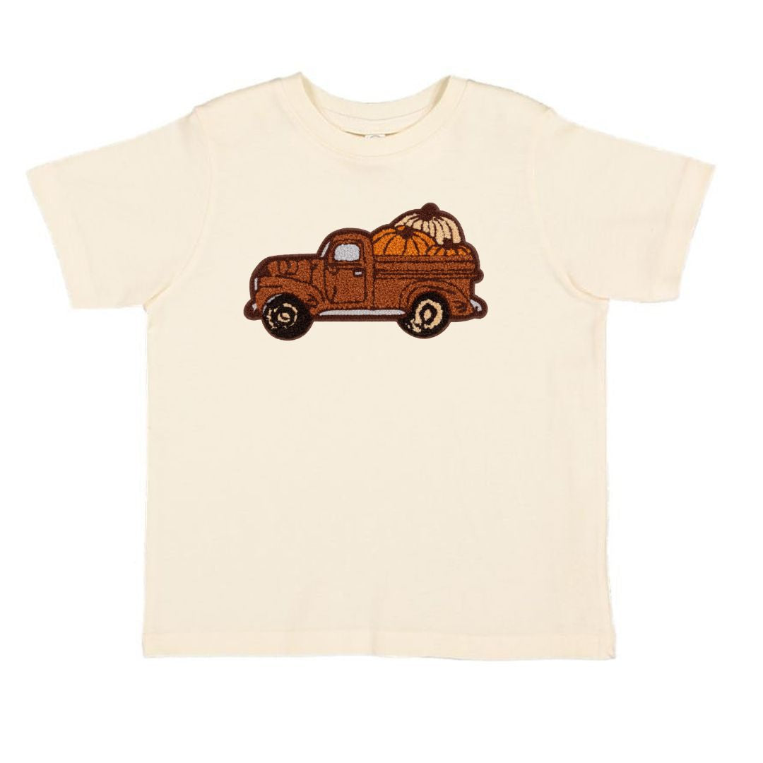 The Fall Truck Patch Short Sleeve T-Shirt is a fun and festive t-shirt for kids celebrating Fall!