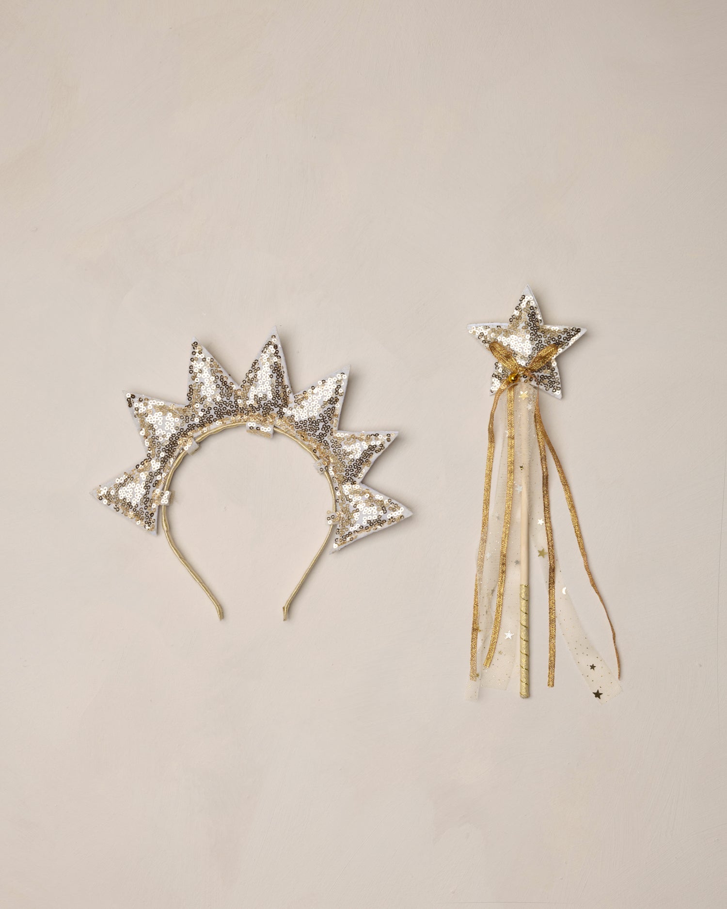 No dress-up look is complete without our sun crown ribboned headband and star wand—crafted from a wooden dowel and adorned with a tinkling bell and flowing tulle ribbon—perfect for every royal occasion.