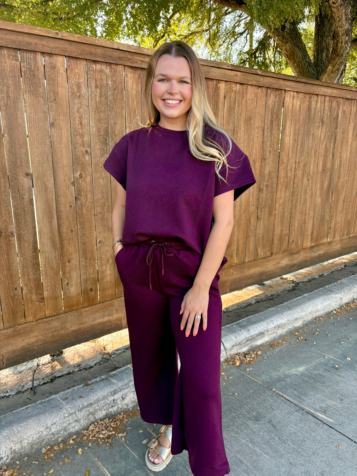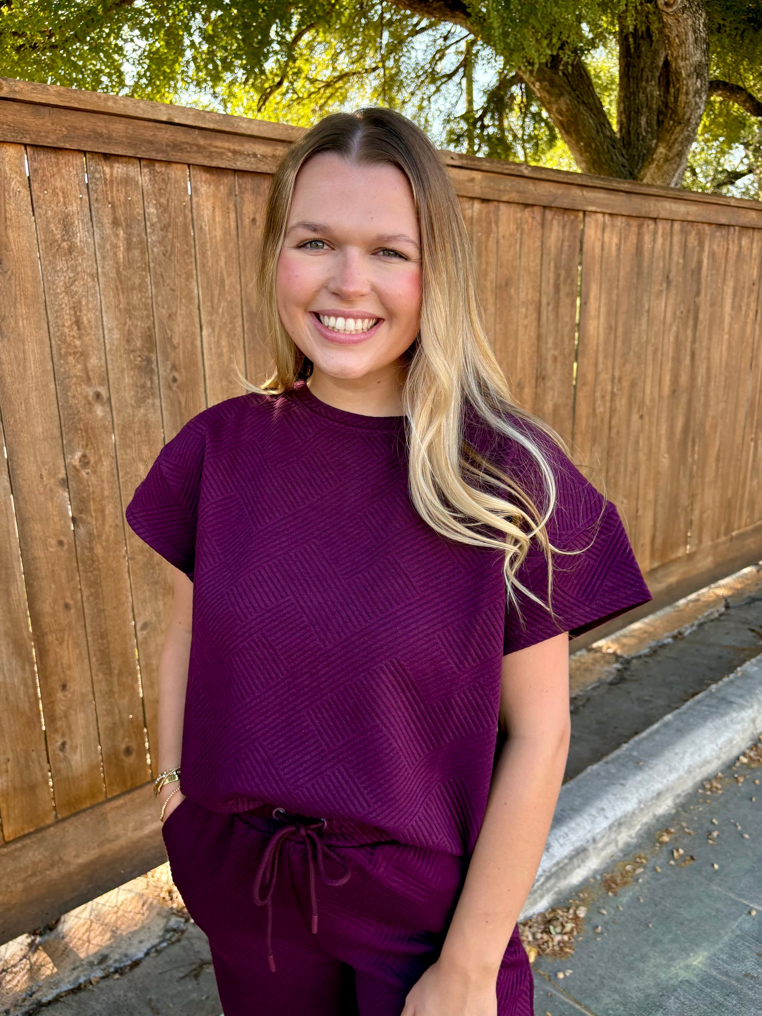 Add a splash of color to your wardrobe with the 'Ready to Relax Quilted Top'! Made from soft fabric, this top will keep you stylish and comfortable all day long. Perfect for pairing with jeans, a skirt or the matching pants for a fun and playful look. Keep it creative with this must-have piece! It features a crew neckline, a subtle crisscross texturing, and wide short sleeves.