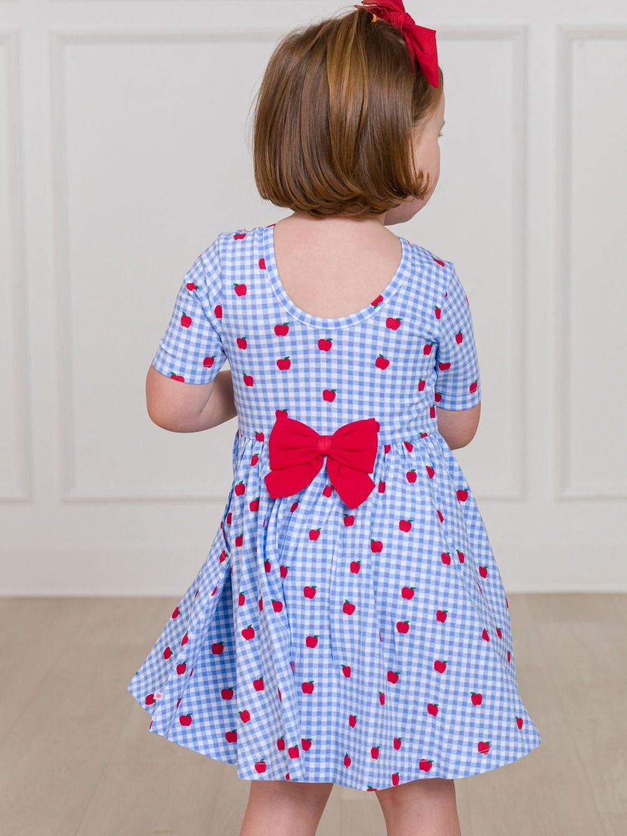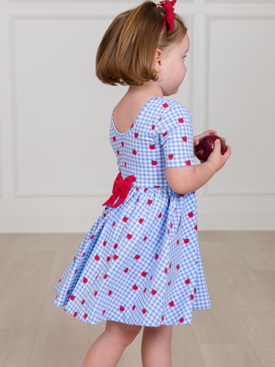 Apple Orchard Gingham Knit Short Sleeve Twirl Dress is the perfect choice for your little girl's wardrobe this season. Featuring a charming blue and white gingham pattern, this stylish girls dress is crafted from a soft knit fabric that ensures comfort throughout the day. Designed with playful twirling in mind, it includes delightful features such as a monogram option, a cute bow detail, and practical pockets.