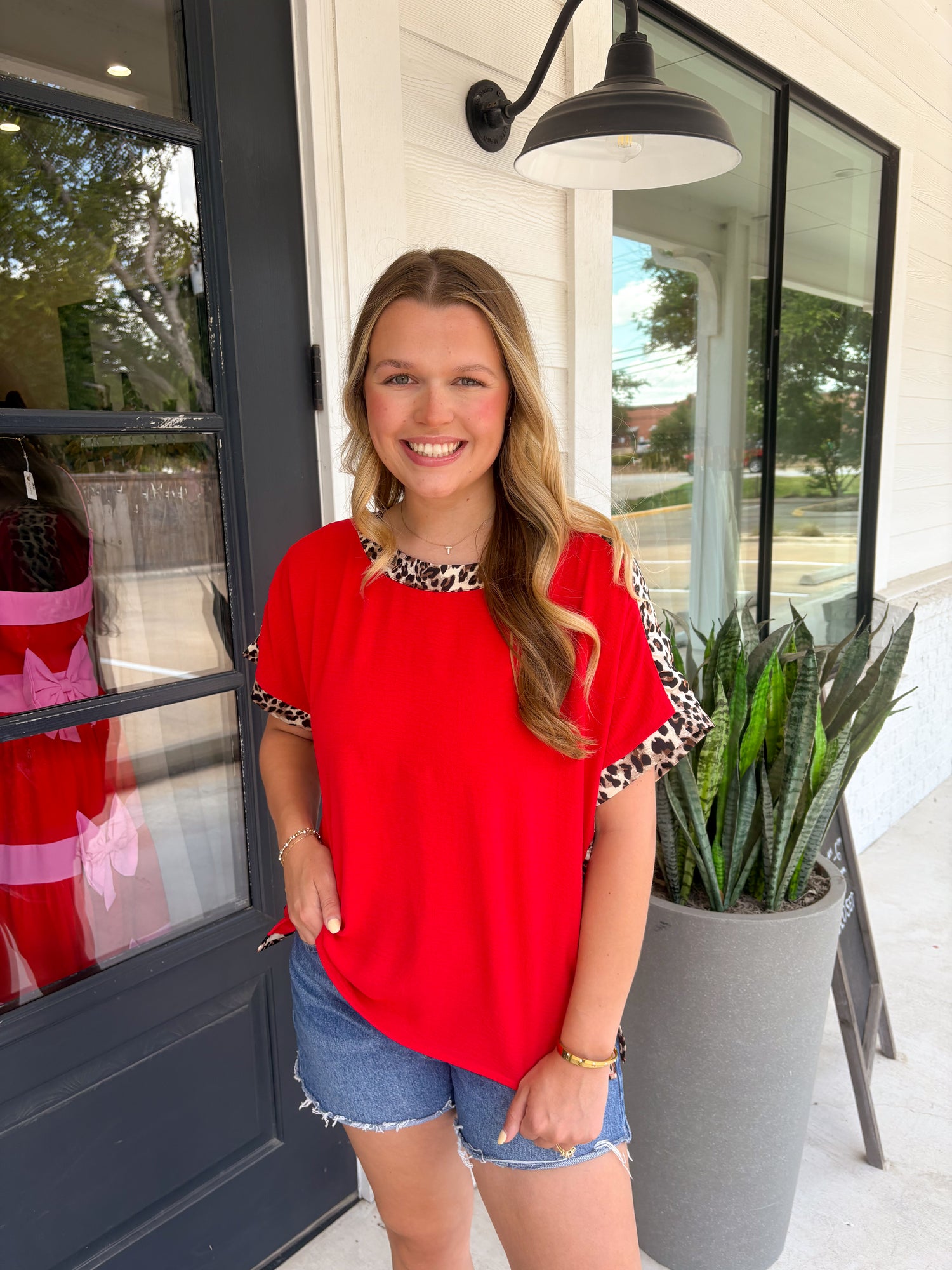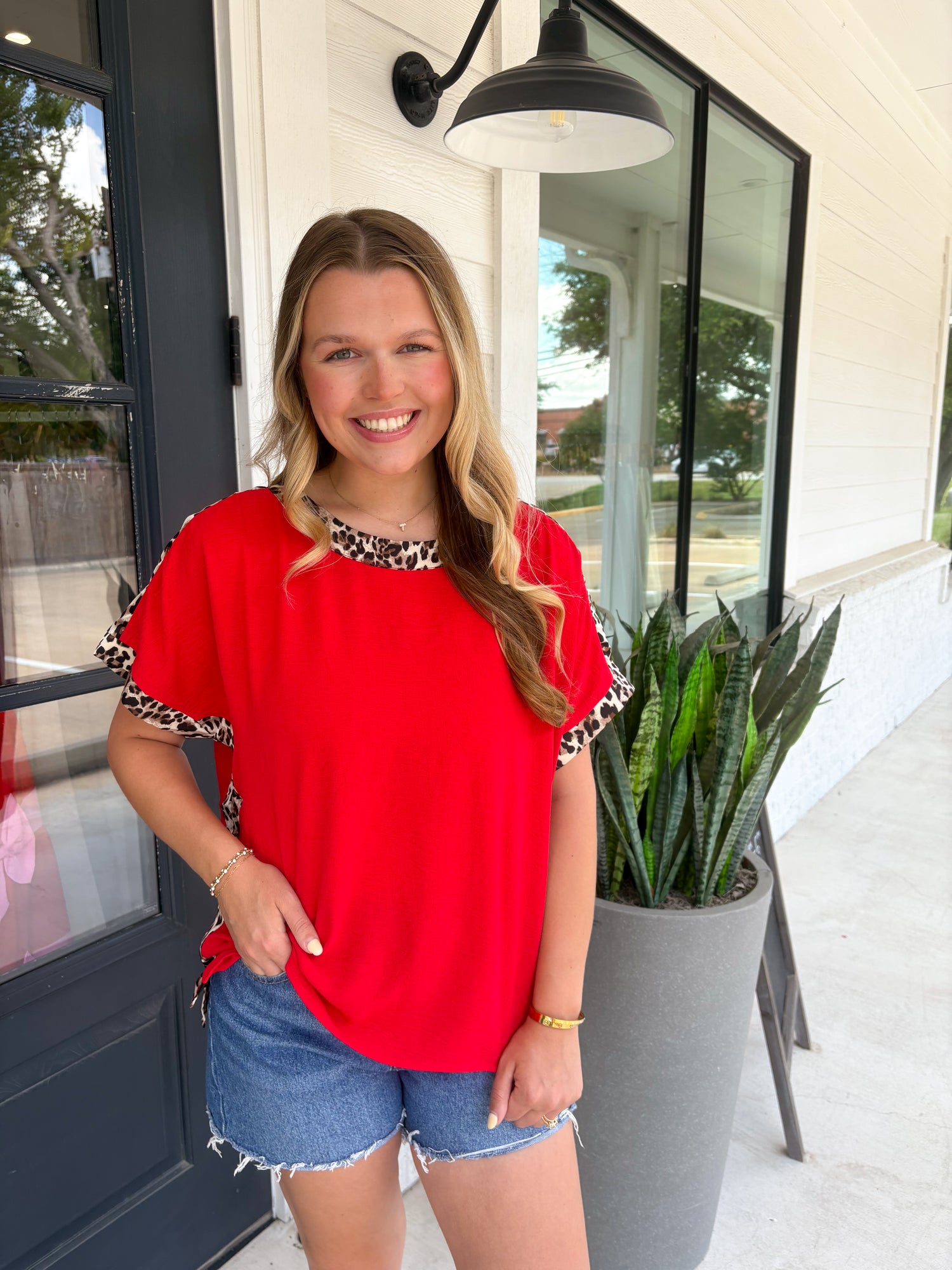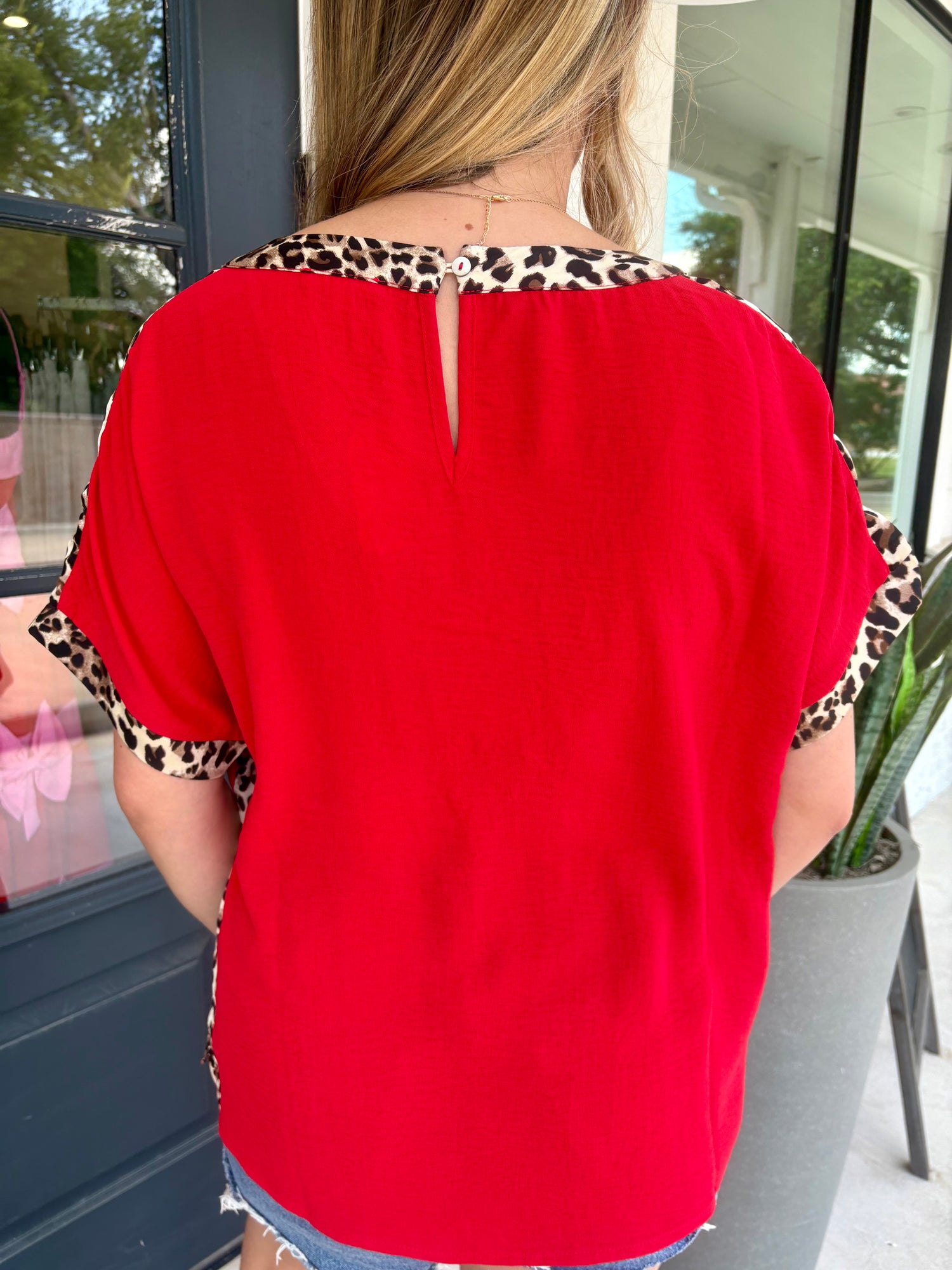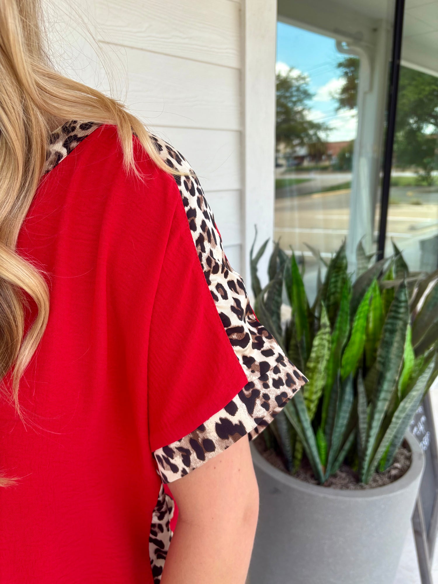 So chic and effortless, this blouse is a standout staple for any wardrobe. Fabricated in a textured woven that drapes beautifully over the body, it gives off a polished yet casual feel. The leopard print contrast against the red or black is so striking yet elegant. With an effortless dolman silhouette, it's so easy to pair with dress pants, tailored trousers, white denim or distressed jeans.