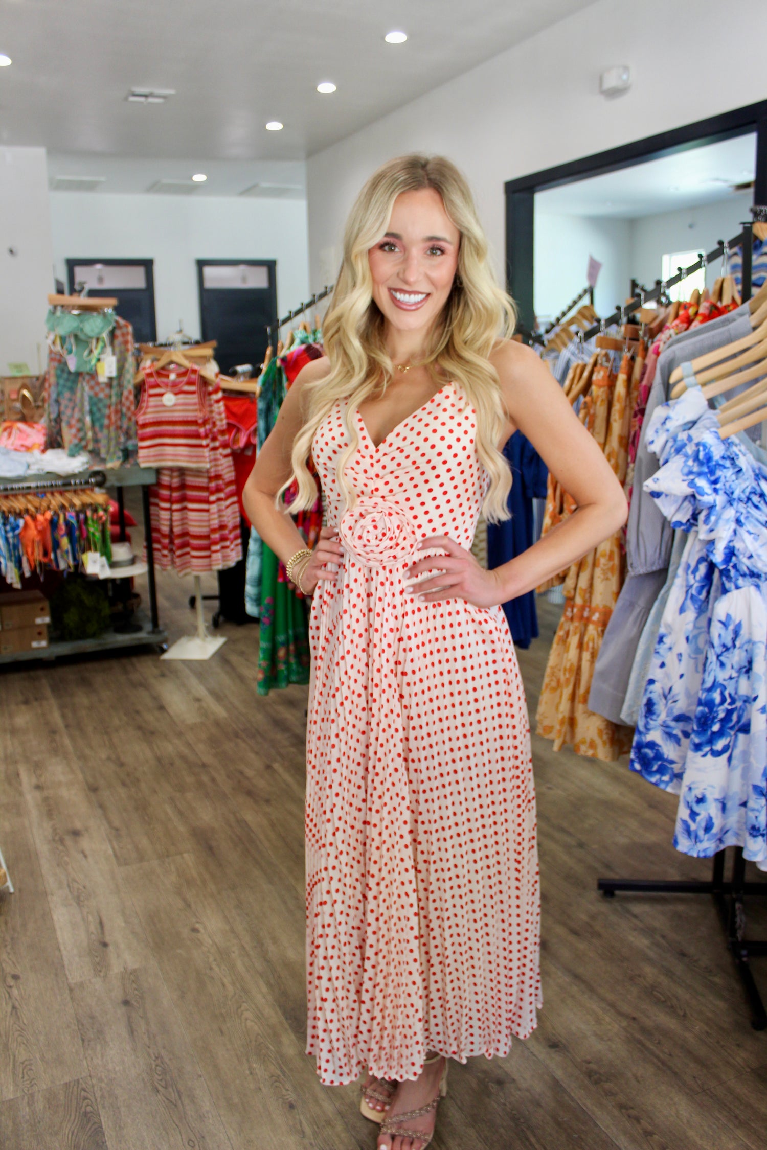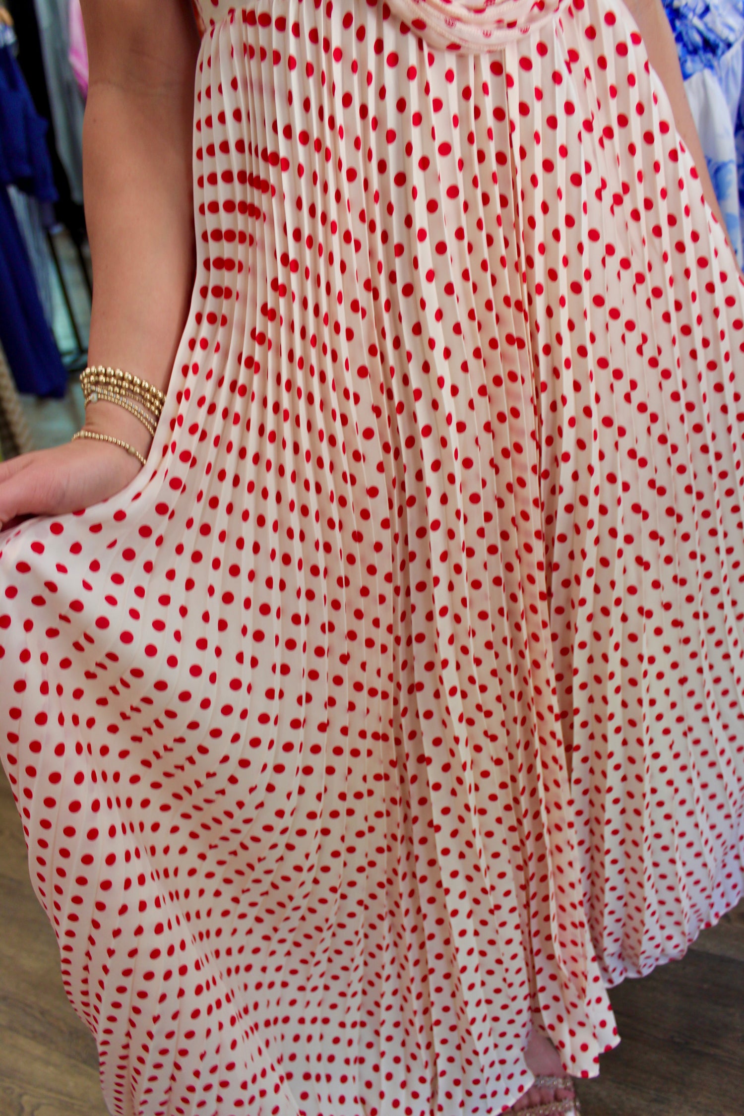 For all the romantic girlies, the 'Shanina Rose Pleated Dress' is the one for you. This beautiful dress features a fit & flare silhouette, a v-neckline, a red polka dot print, a back zipper closure & a pleated skirt! This dress is so unique & trendy for Spring & Summer!