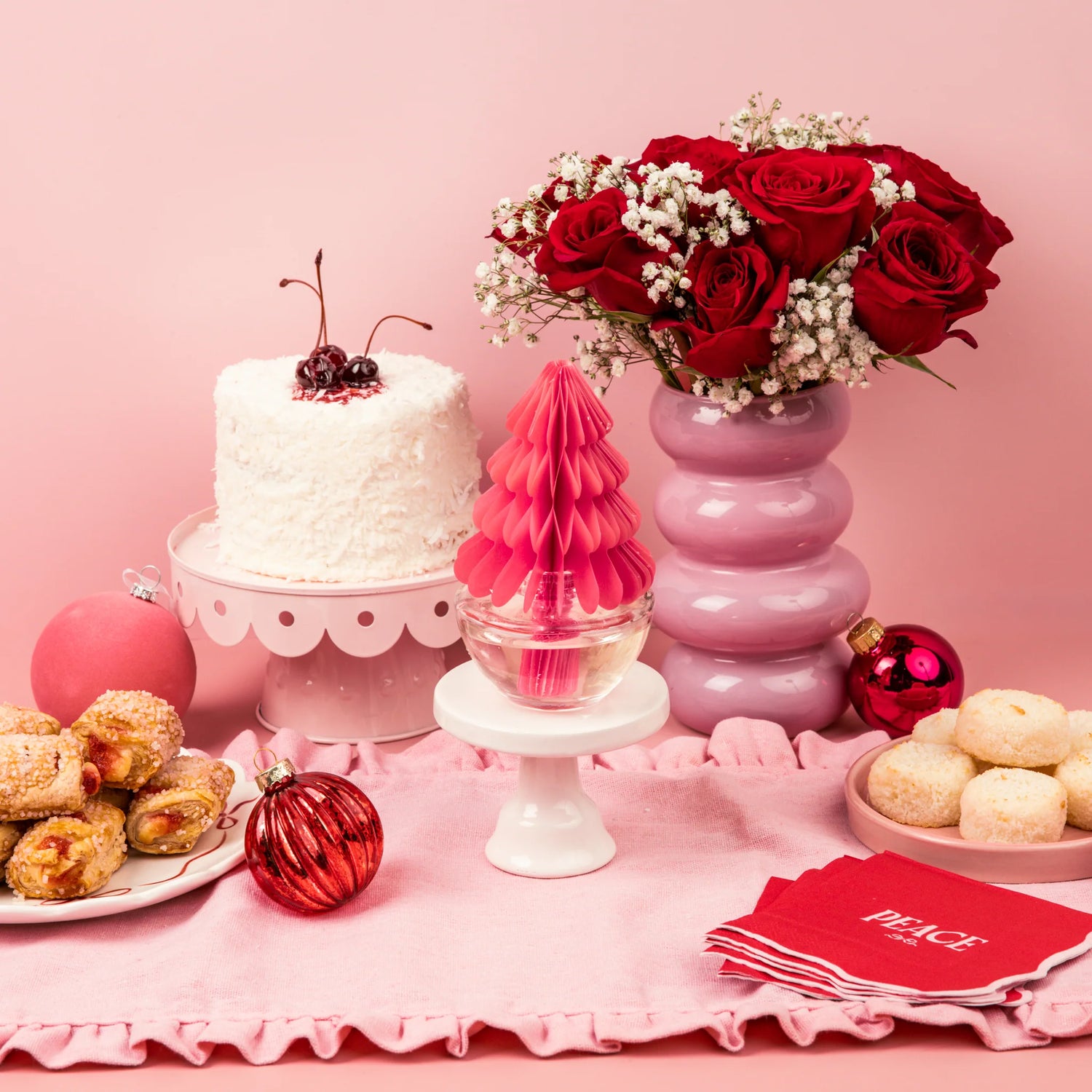 - Festive design – Clear glass vase + whimsical pink paper tree for instant holiday cheer