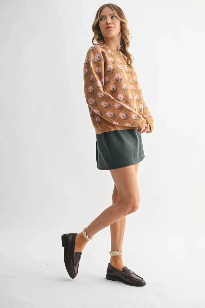 This mocha-colored button-up cardigan features a delicate floral jacquard pattern in soft pink tones, adding a feminine touch to a classic silhouette. Crafted from a cozy knit, it offers warmth and comfort with long sleeves and a timeless crew neckline. The subtle texture and refined colors make it an ideal layering piece for both casual and dressier occasions.