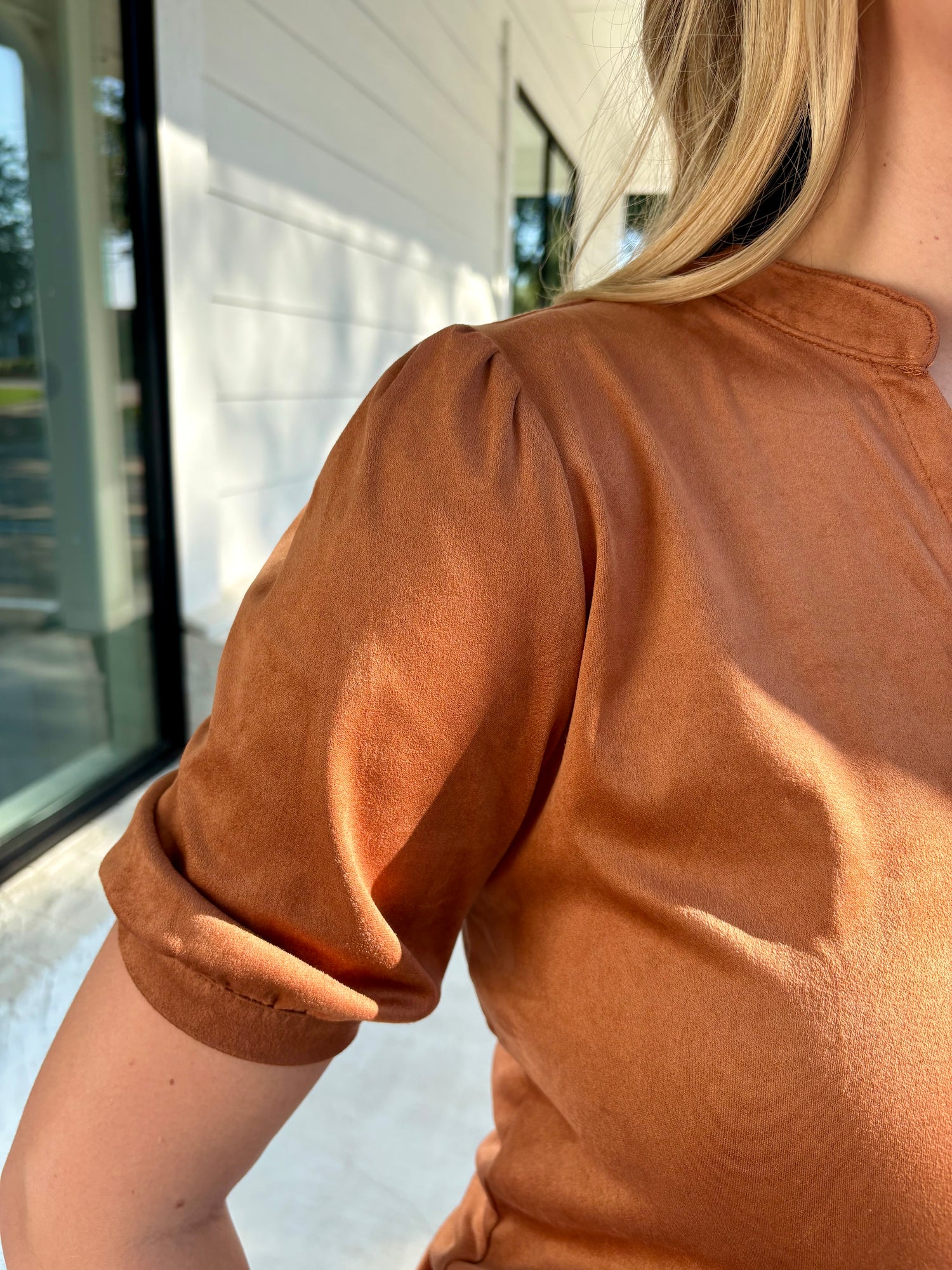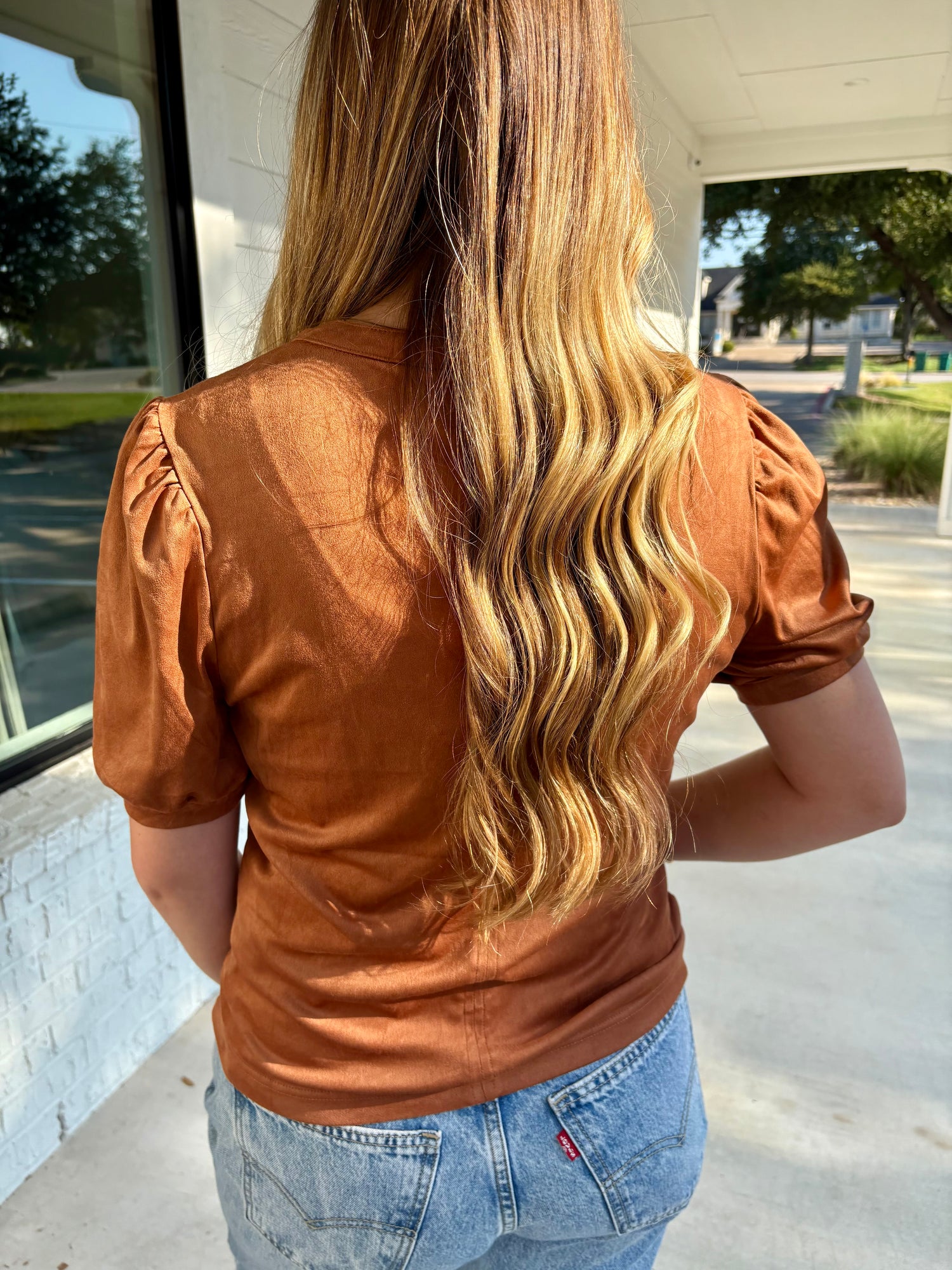 The Brown Sugar Kalia V-neck Puff Sleeve Top in suede combines elegance and modernity with its sleek design. Crafted to offer both comfort and style, this top is perfect for any occasion. Classic fitting pairs beautifully with everything from jeans to skirts, a reliable staple season to season.