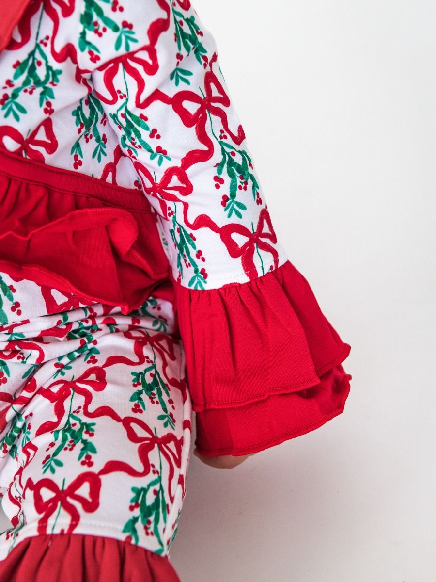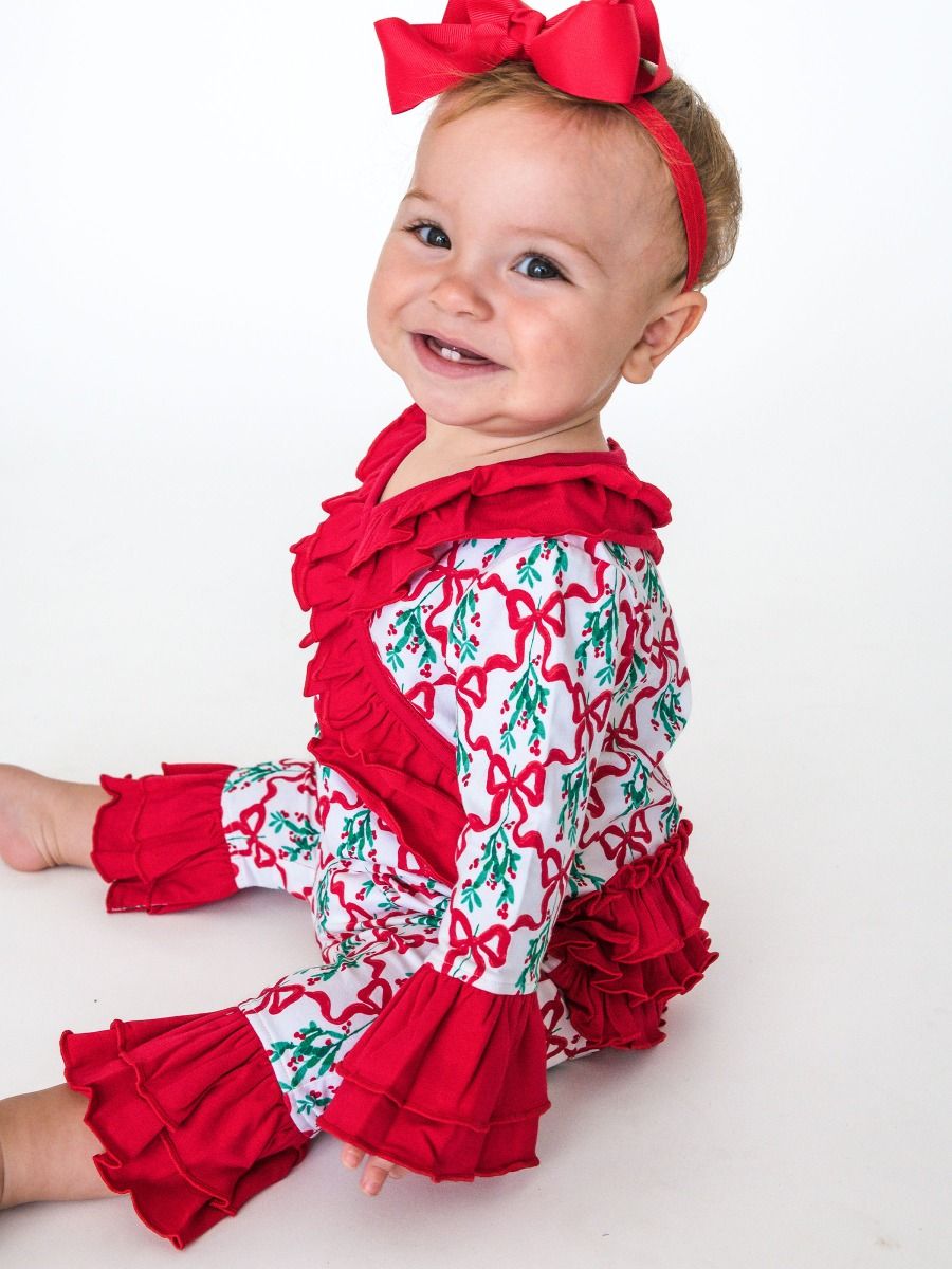 The protective knee feature of this comfortable baby romper helps shield your child's knees as they move about, making it an excellent choice for crawlers. The white knit romper is monogram-free, focusing purely on its charming design and functional elements. Whether it's a playdate or a casual family gathering, the Carol of the Bows romper blends comfort, style, and practicality effortlessly.