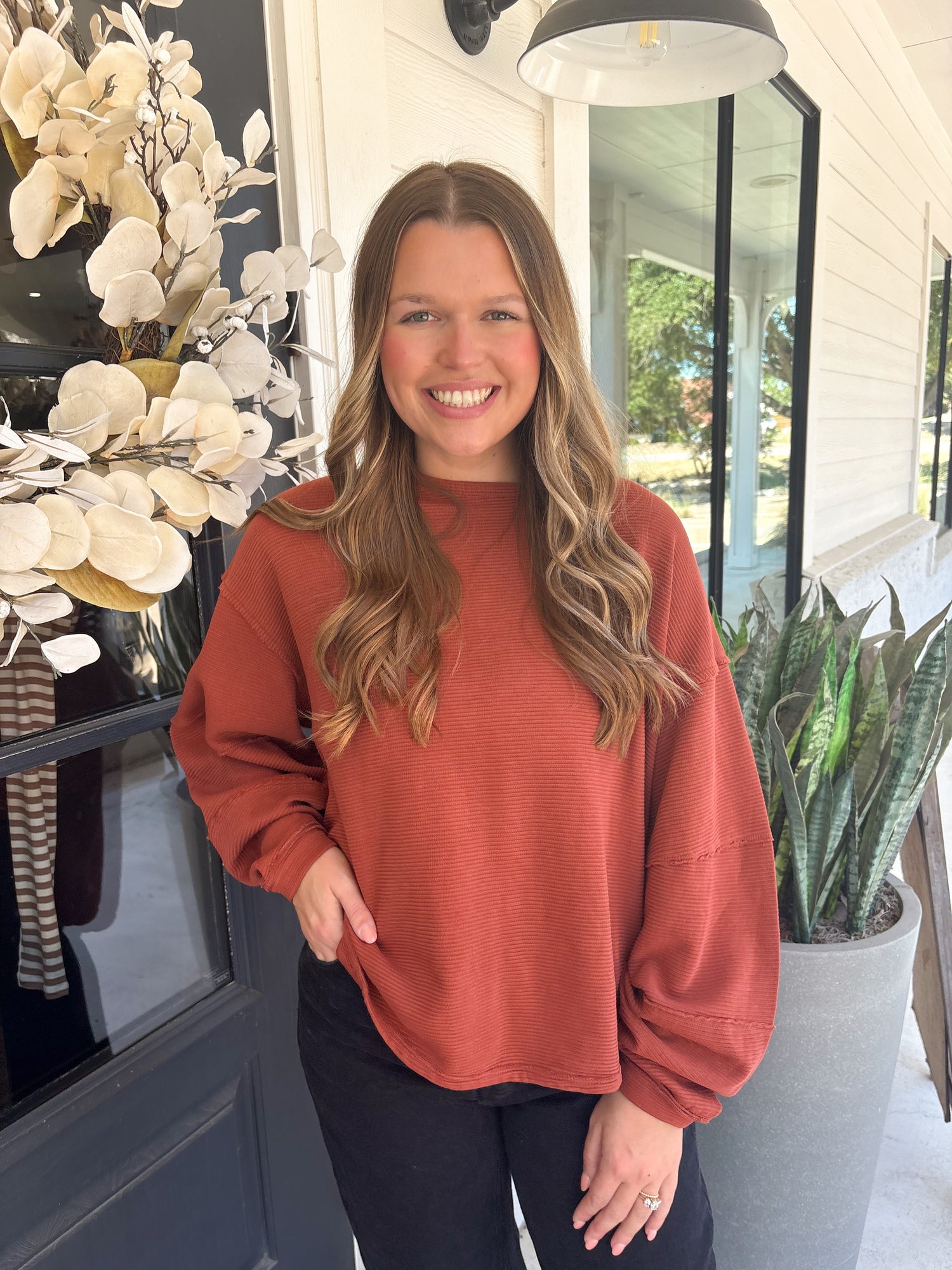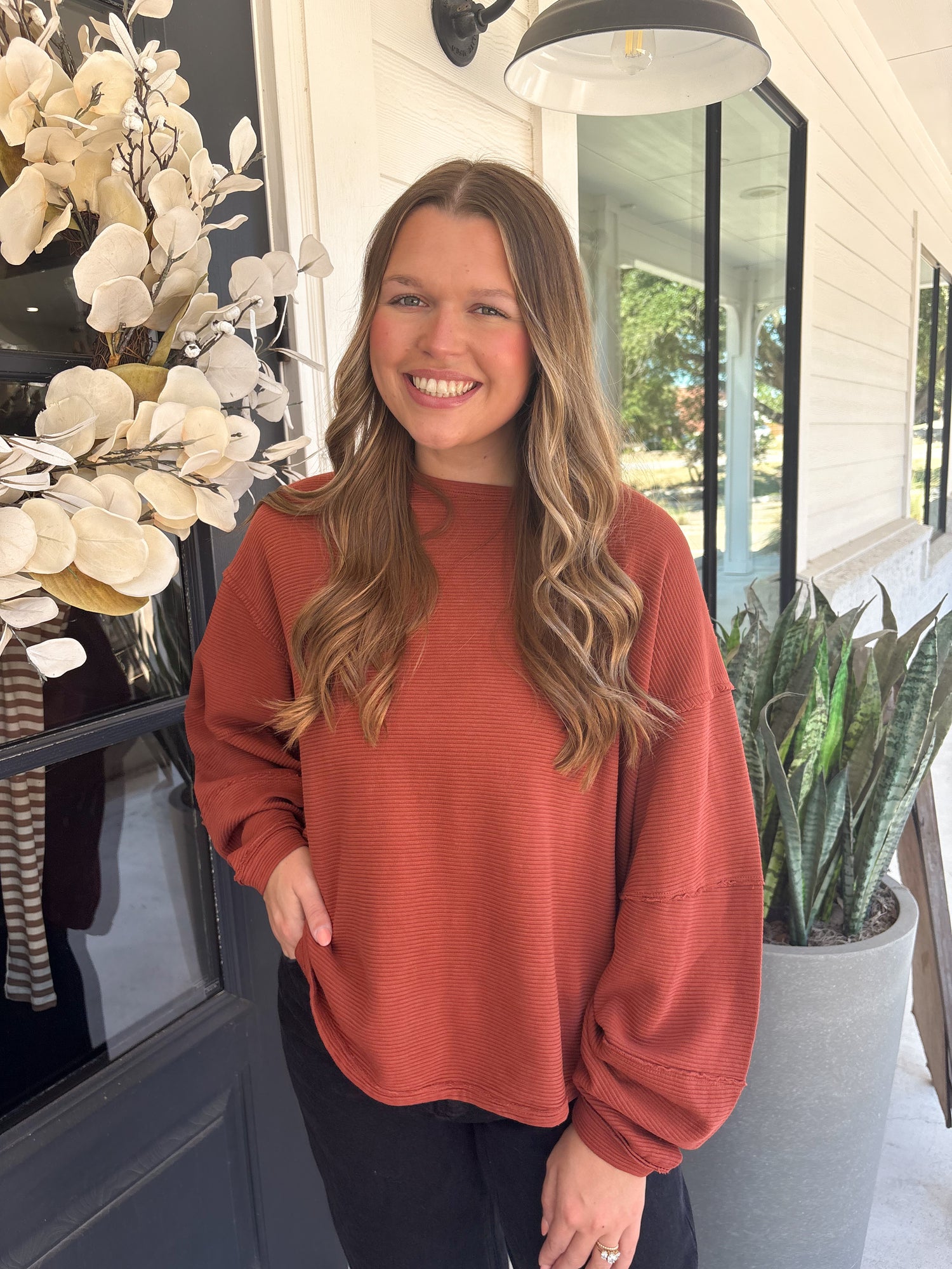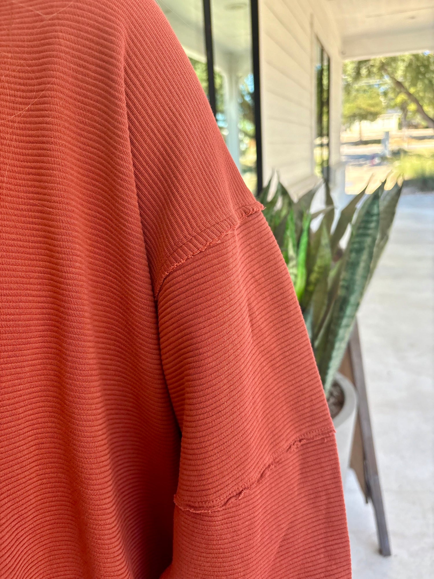 Features: Soft ribbed knit fabrication, slight scoop neckline, dropped dolman sleeves with cuffed hems, raw trim throughout