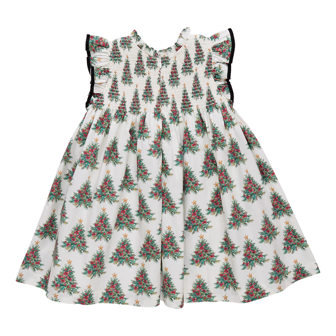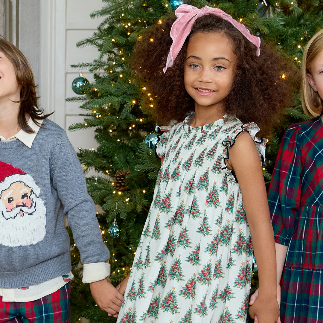Winter Wonderland! A forest of dazzling evergreens lights up our elegant and vintage-inspired Girls Stevie Dress in Vintage Trees. Dressmaker details include a fluttery black velvet ruffled trimmed sleeve, subtle ruffle at the neck and a nostalgic smocking at the chest. Invisible zipper closure at the back.Twin with baby sis in our Baby Girls Stevie Dress Set.