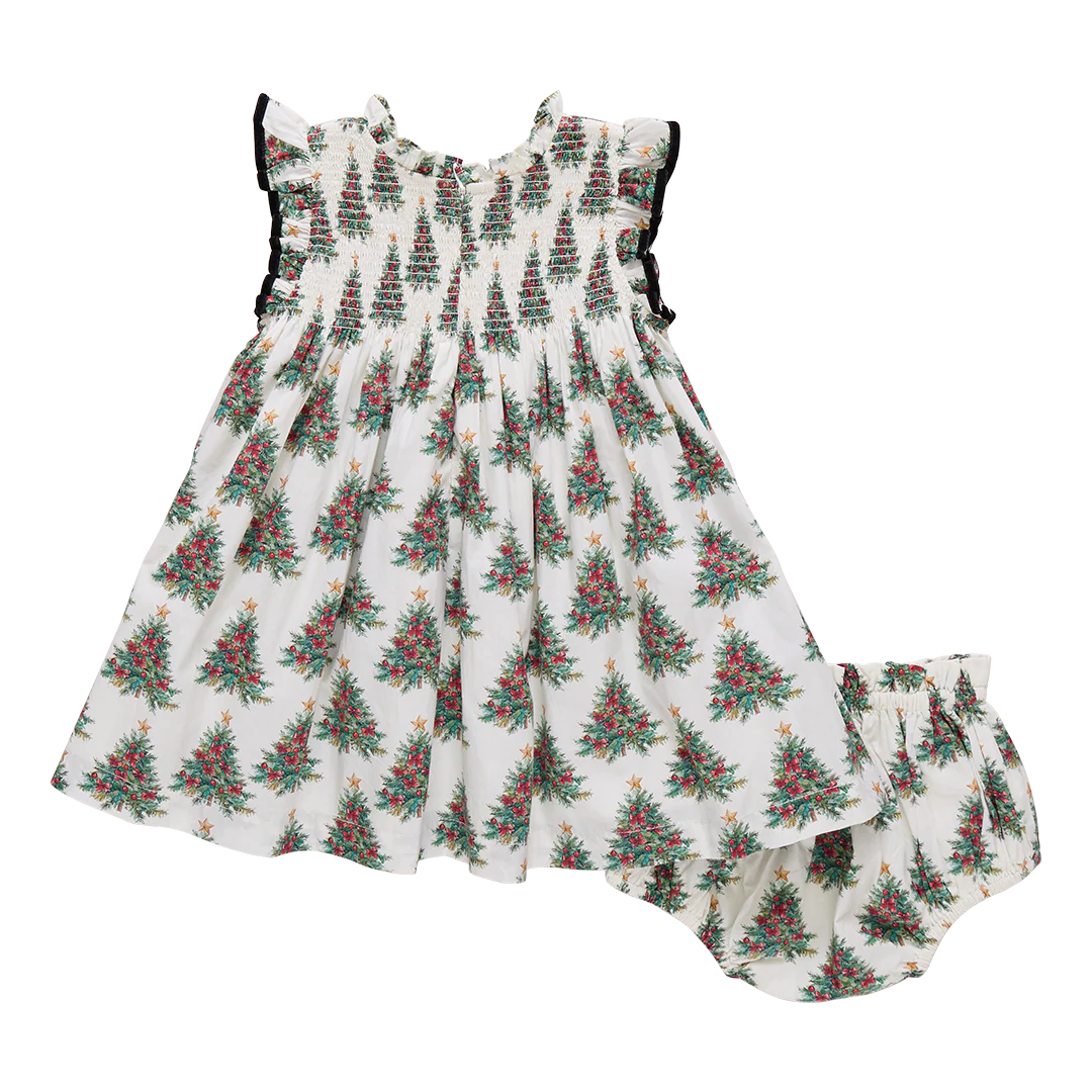 Winter Wonderland! A forest of dazzling evergreens lights up our elegant and vintage-inspired Baby Girls Stevie Dress Set in Vintage Trees. Dressmaker details include a fluttery black velvet ruffled trimmed sleeve, subtle ruffle at the neck and a nostalgic smocking at the chest. Invisible zipper closure at the back. Set includes a matching diaper cover with fixed black satin bow at the waist. Twin with big sis in our Girls Stevie Dress.