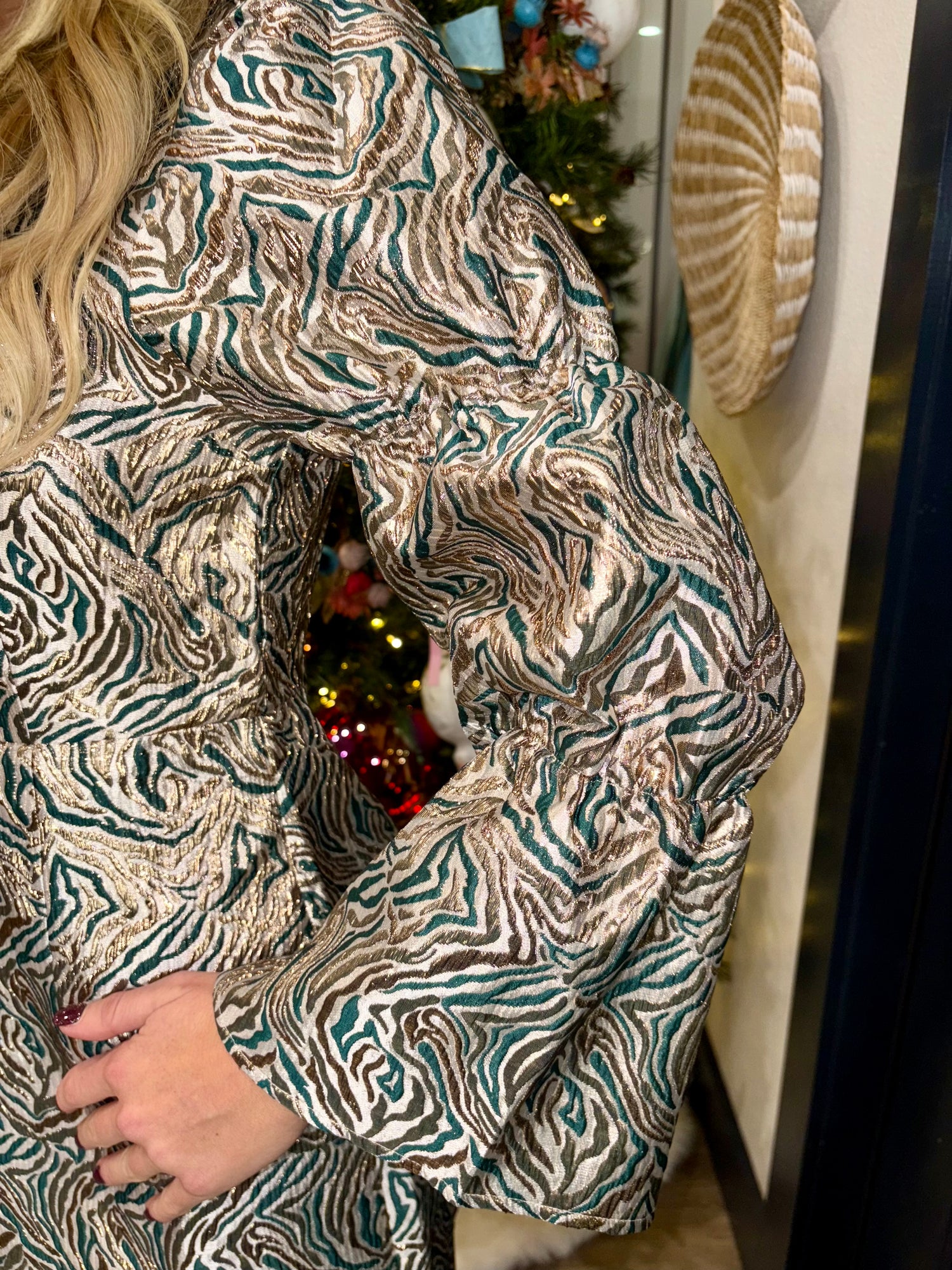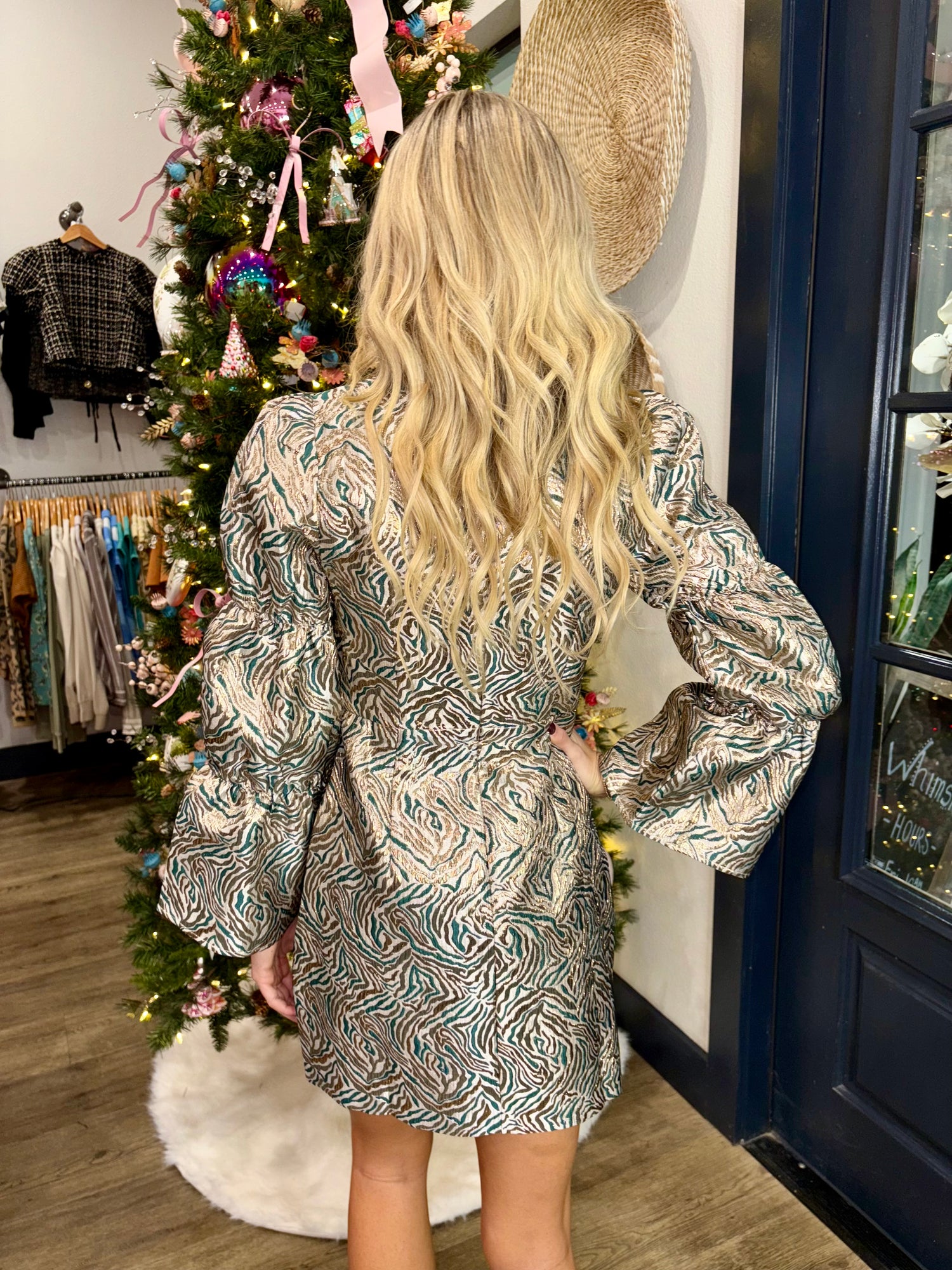 Meet the new Zebra Jacquard Anika Mini Dress! Chic, feminine, and flirty are all words we would use to describe this mini dress! Boasting shiny gold & blue zebra stripes and super unique long sleeves. Its tailored fit is so flattering! Pair with boots or heels to complete this seasonal look!