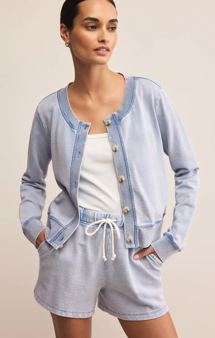 Soft yet structured, this relaxed cardigan is made from knit denim French terry, featuring a versatile crew neckline and easy-going silhouette. So comfortable, it just may become your new favorite laid-back layer.